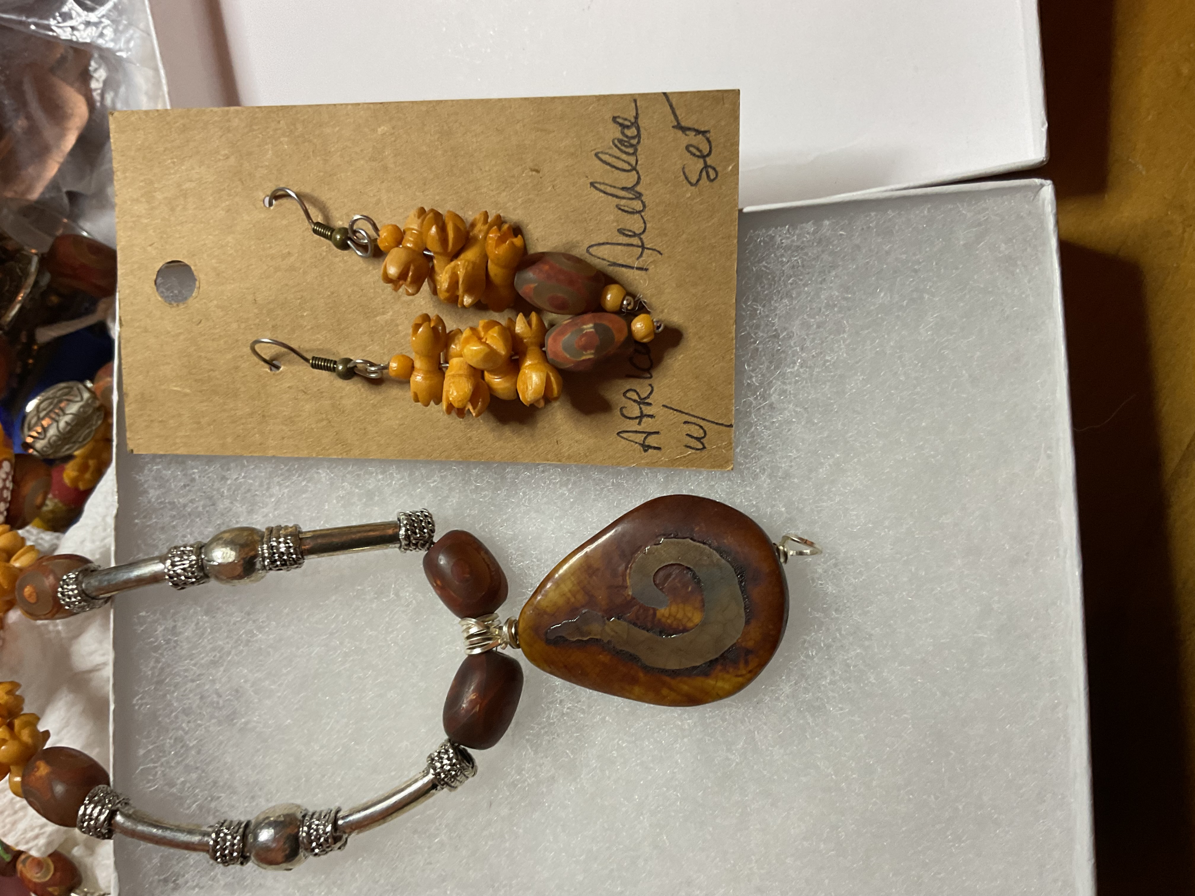 African Beaded Necklace with Bullseye Jasper Focal with Arican Beads and Bulldeye Jasper Beads with silver colored accents