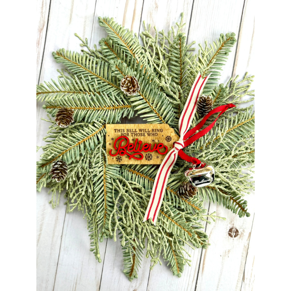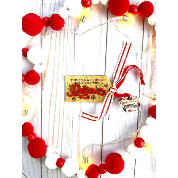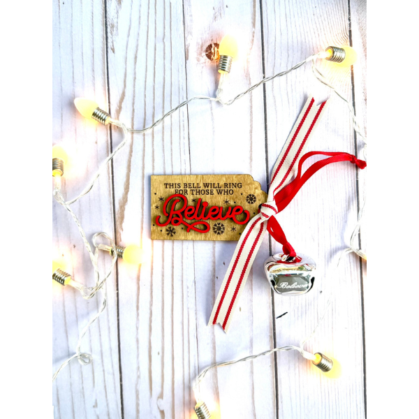 Bring the magic of Christmas to life with this Polar Express-inspired “Believe” Bell Ornament. Crafted with a rustic wooden tag engraved with the words “This bell will ring for those who believe”, it’s paired with a shiny silver bell and a festive red-and-white striped ribbon — a perfect reminder of the wonder and joy of the holiday season.