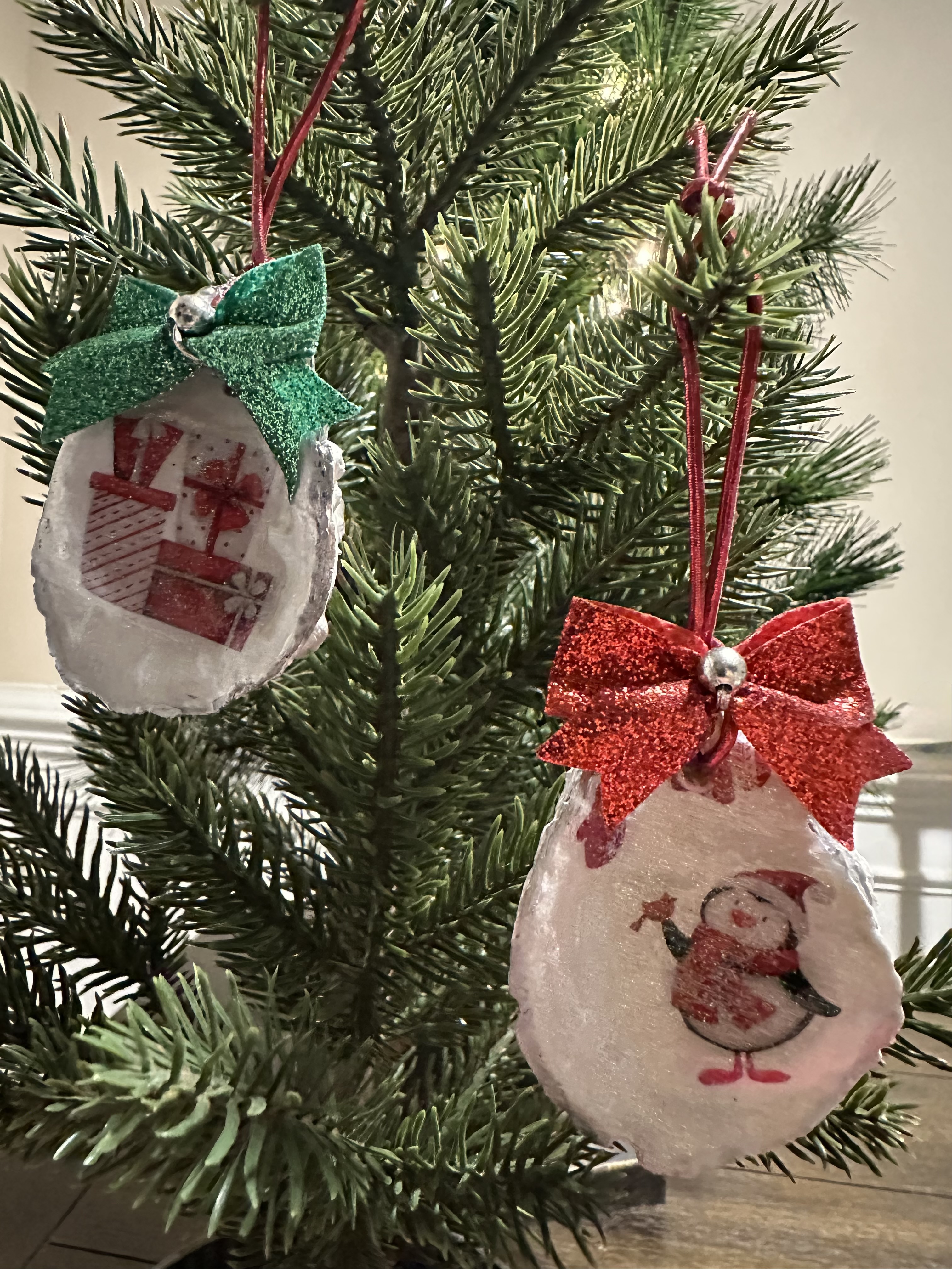 - Each ornament comes with a red ribbon for easy hanging, and a festive red or green bow at the top.