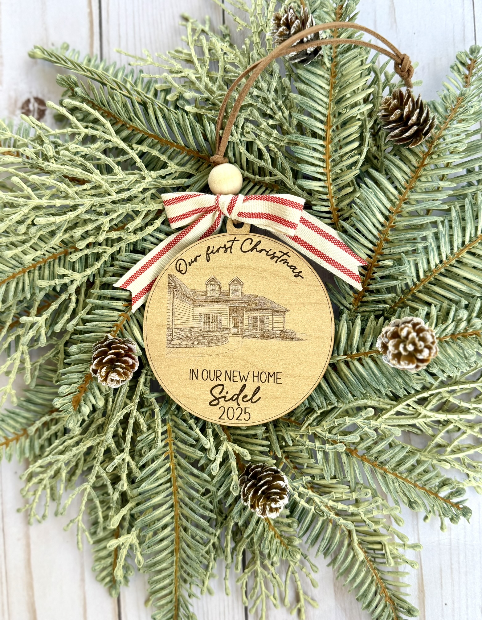 This personalized laser-engraved wood ornament features a detailed line art drawing of your house — paired with custom text such as Our First Christmas, family name, and year.