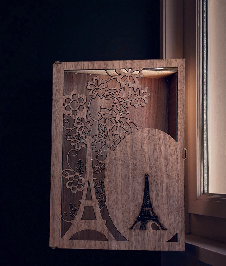 Rosewood Plywood Box – Distinctive reddish hue with a refined Eiffel Tower cutout.