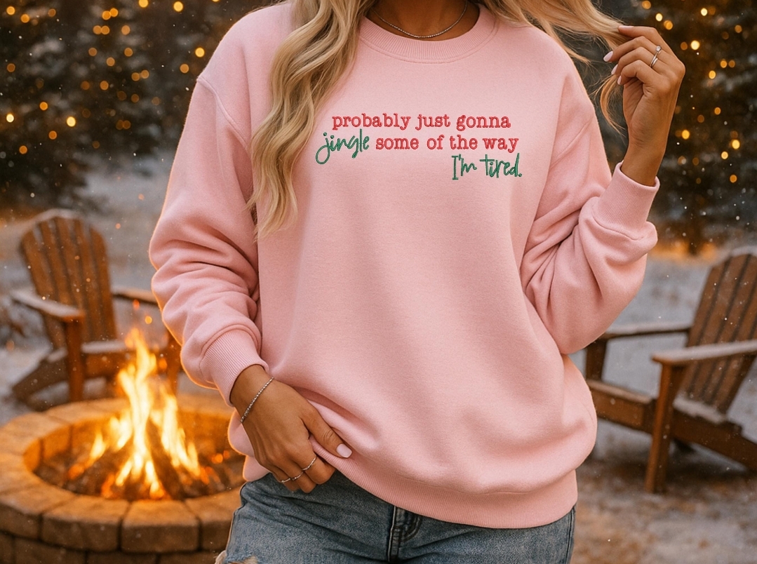 Add humor and comfort to your holiday wardrobe with this cozy Christmas sweatshirt! Designed for anyone who loves festive vibes but also embraces the reality of being tired, this sweater is the perfect mix of cute, comfy, and funny. Whether you’re baking cookies, wrapping gifts, or cozying up by the fire, this holiday crewneck keeps you warm and stylish. What’s Included: 1 unisex crewneck sweatshirt Embroidered Festive holiday text: “Probably just gonna jingle some of the way, I’m tired” in red and green print Soft, breathable cotton-blend fabric for all-day comfort Relaxed fit, great for lounging or layering Perfect for Christmas parties, casual winter wear, or a fun holiday gift Get ready to sleigh the holidays with comfort and laughter—grab your funny Christmas sweatshirt today!