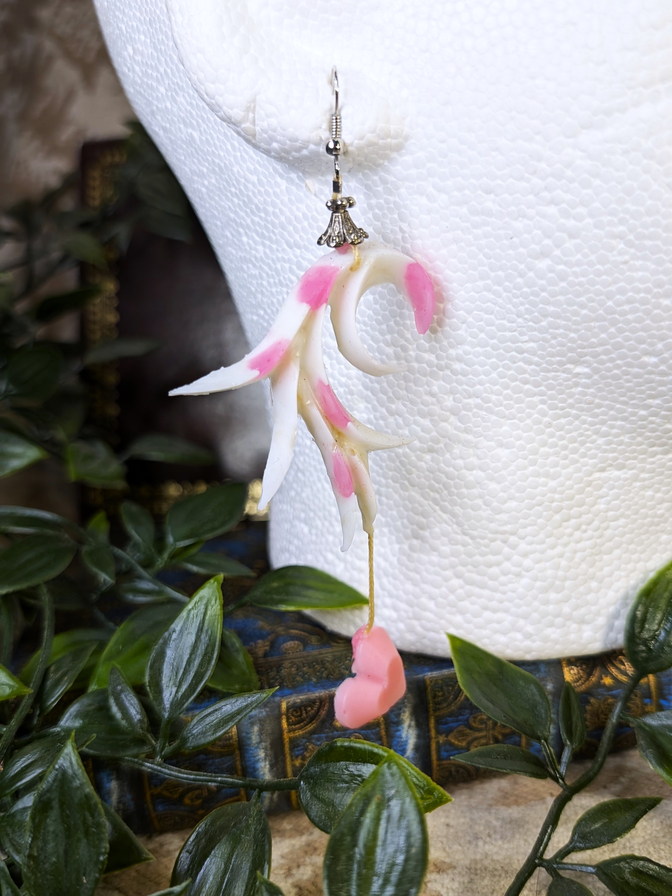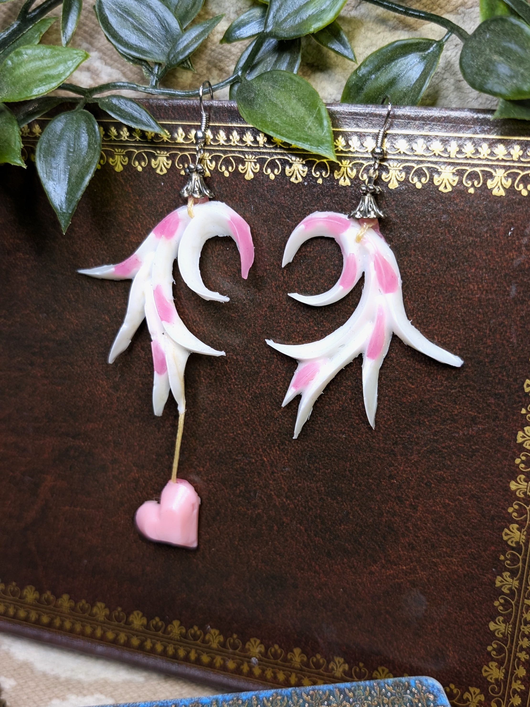 Original handmade earrings in semi-translucent white with pink spots and a darling little heart dangling from one of the earrings, a colorway named “perfect angel.”