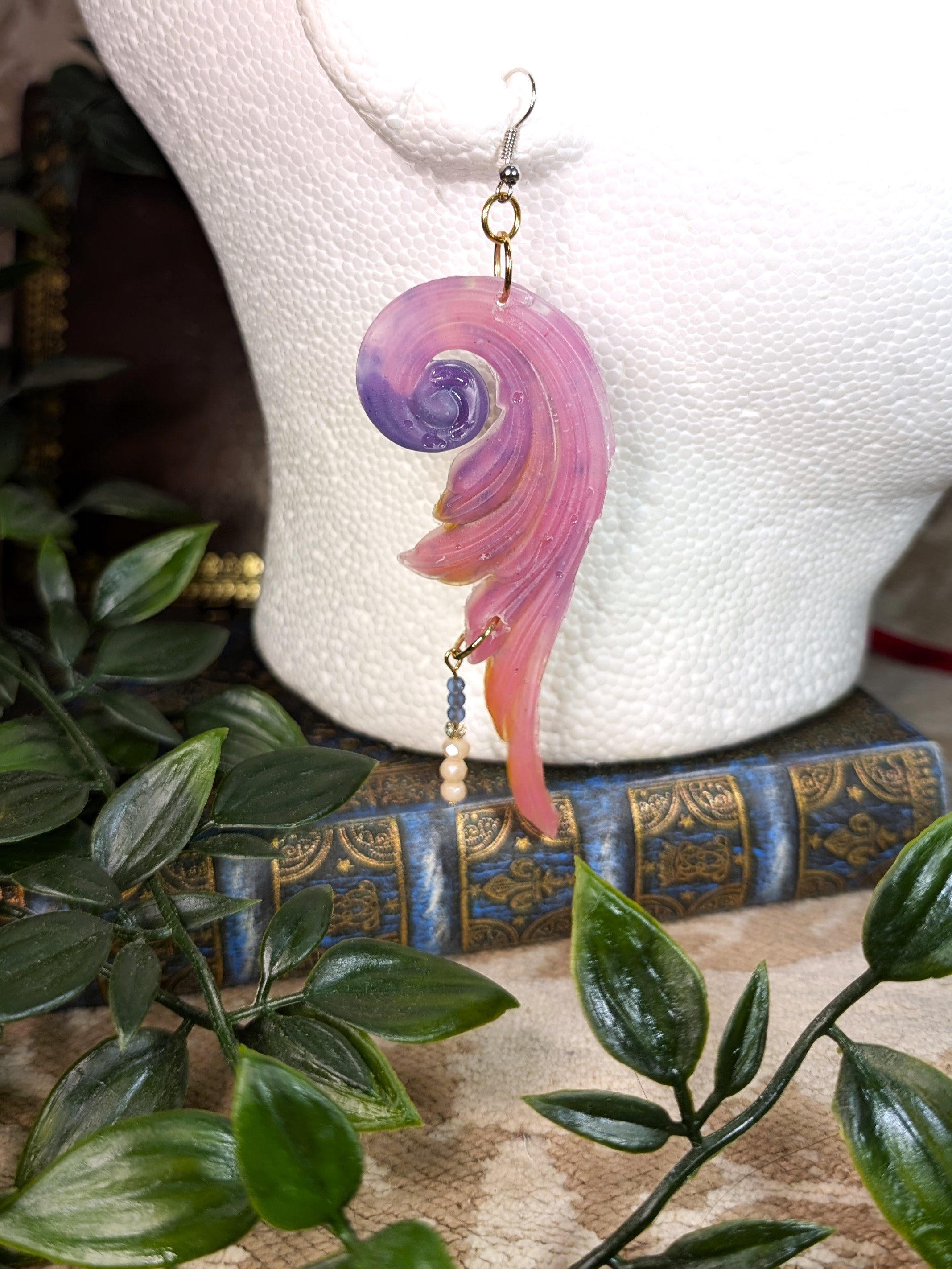Original handmade earrings in semi-translucent purple, pink, and orange, with a small dangle of pale pink and purple beads. Design looks like the flourishes you’d find on vintage furniture or decorations, with a little bit of fantasy flair. Showstopping, eye-catching size and shape, perfect for an event. These have a semi-matte finish.
