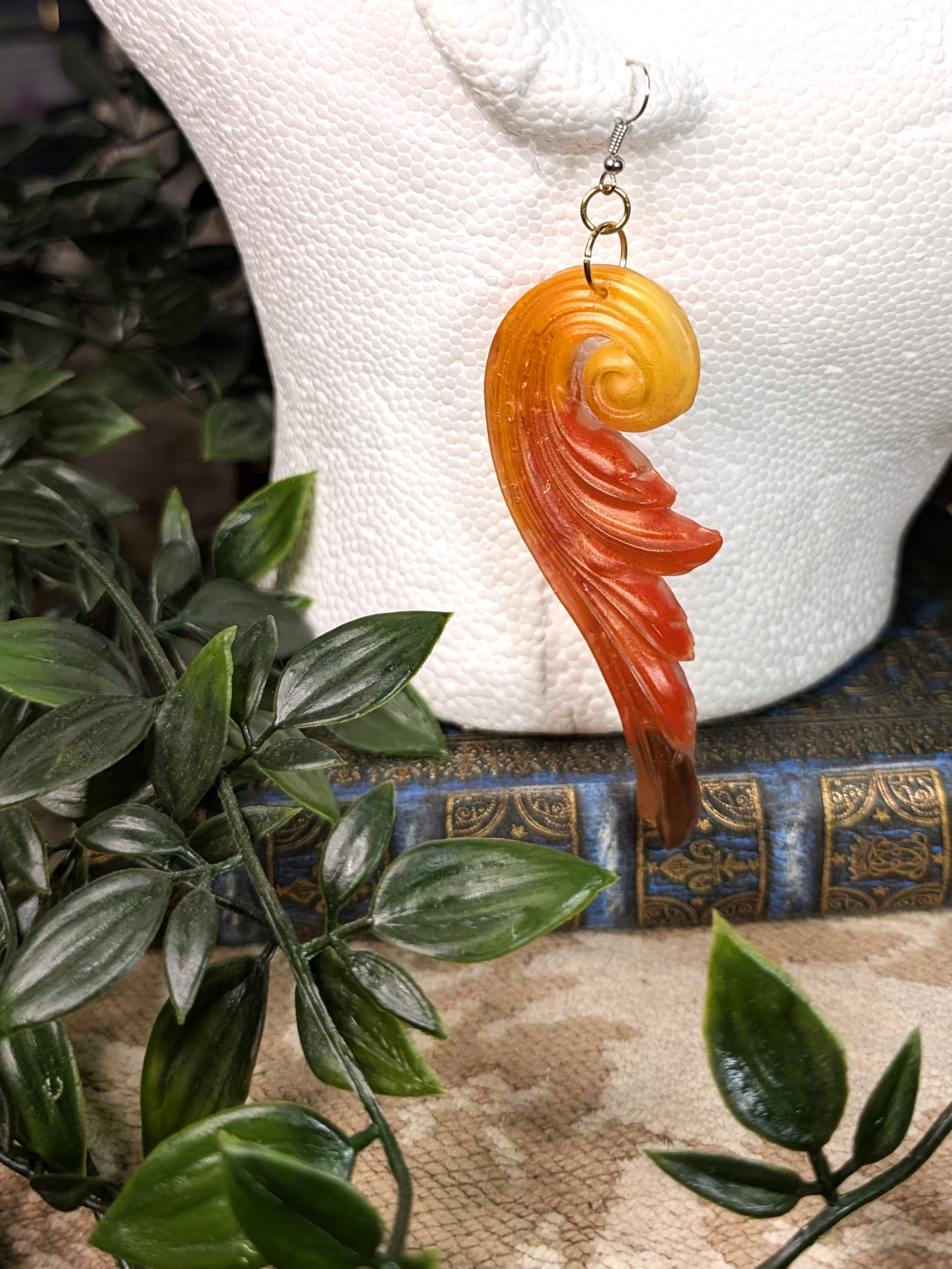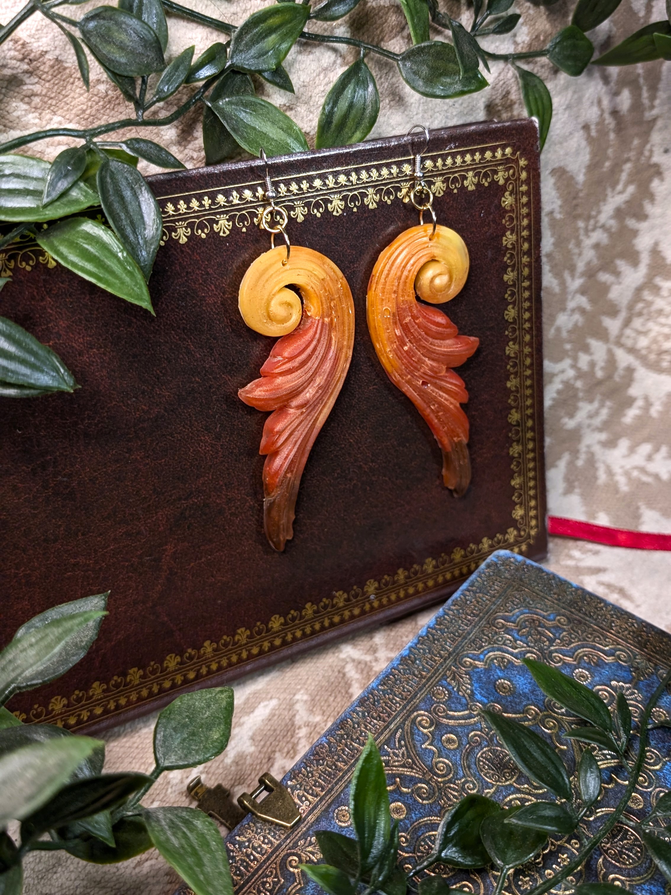 Original handmade earrings in semi-translucent orange, red, yellow, and brown. Design looks like the flourishes you’d find on vintage furniture or decorations, with a little bit of fantasy flair. Showstopping, eye-catching size and shape, perfect for an event. These have a semi-matte finish.