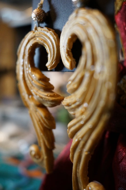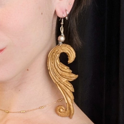 Original handmade earrings, iridescent goldtone with gold bead accents. Design looks like the flourishes you’d find on vintage furniture or decorations, with a little bit of fantasy flair. Showstopping, eye-catching size and shape, perfect for an event.
