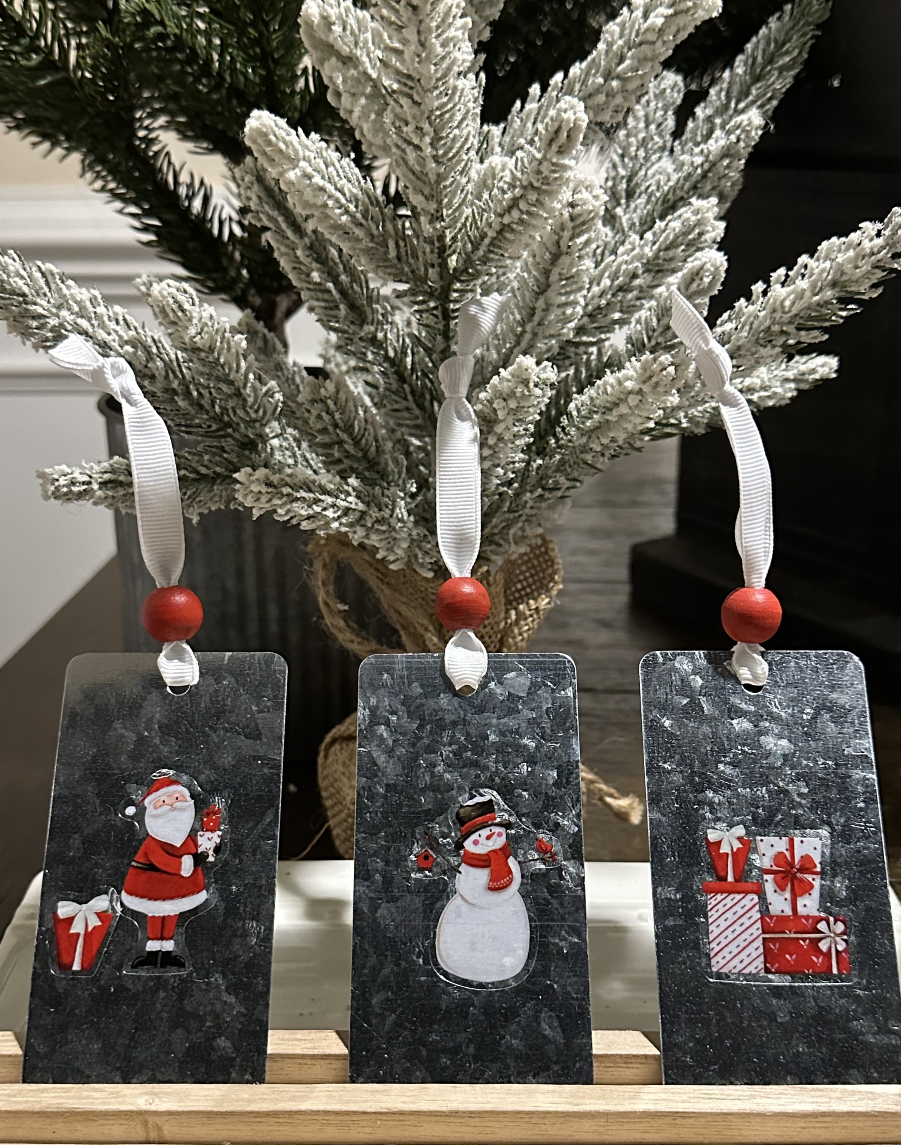 - Each tag depicts our favorite Christmas characters, and are adorned with white ribbon and a large red wooden bead.