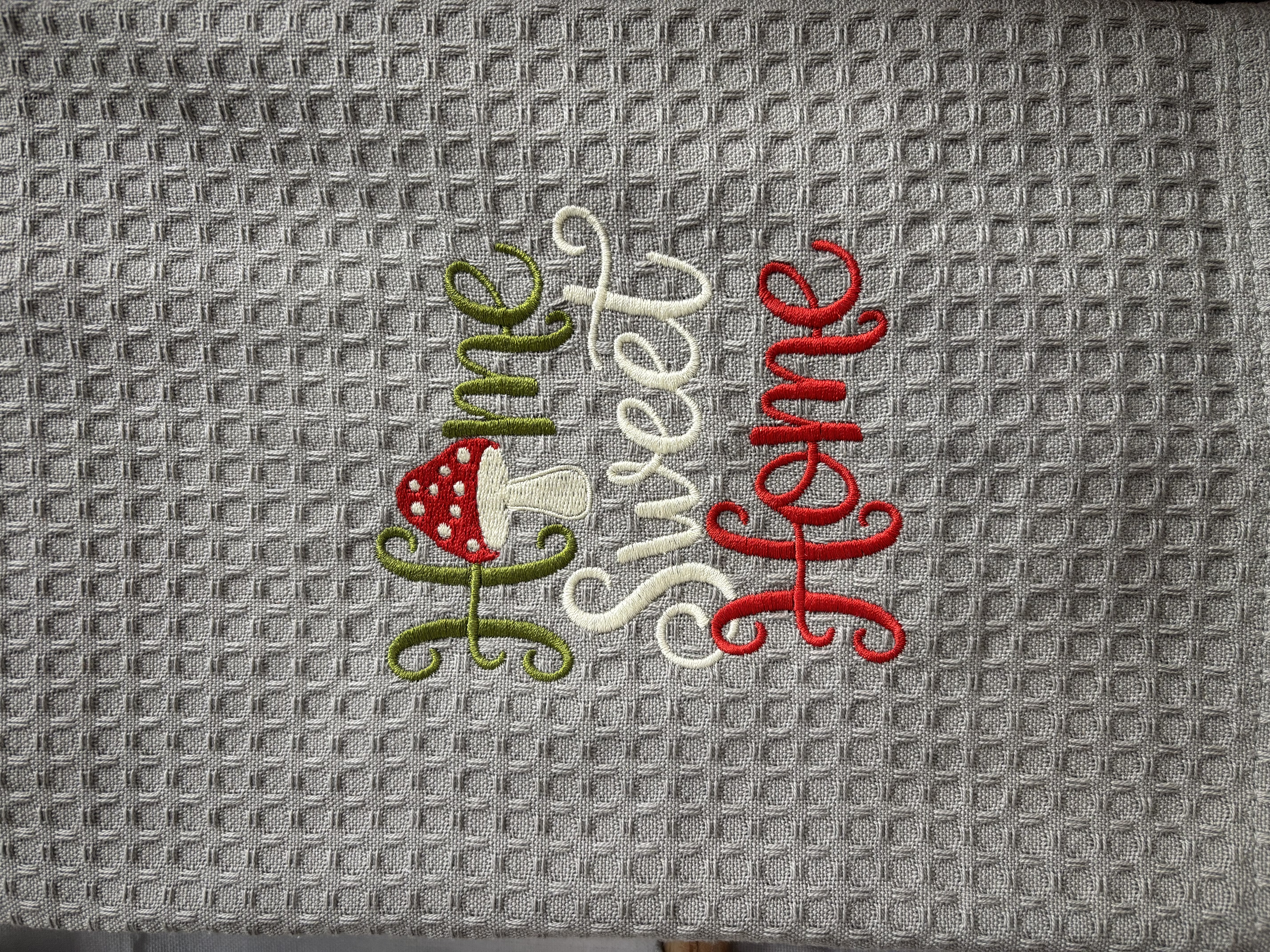 This is a gift set of a pillow sham with gray trim and a gray kitchen towel to match. Home Sweet Home with a cute mushroom. The pillow sham is 20 x 20 and can be stuffed with an insert measuring 20 x 20 for a fuller look or 18 x 18 for a less full look. Insert NOT included. The kitchen towel is a waffle weave and will look great in any kitchen.