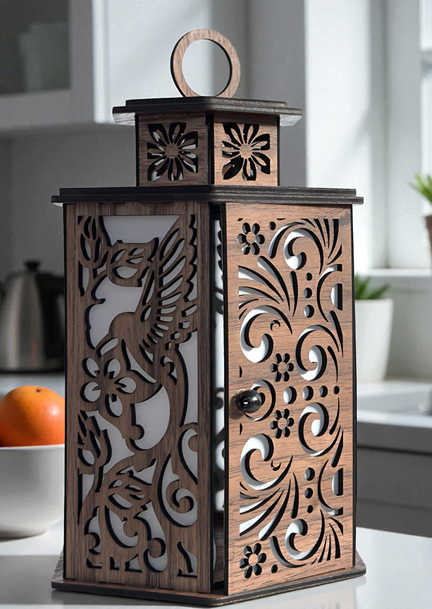 This hummingbird and floral lantern is a laser cut wooden lantern featuring delicate floral patterns on 4 panels and a hummingbird cut on 2 panels. Each panel has vellum on it so that the inside LED candle light is diffused giving a much softer light. One panel is a door so you can access the included LED candle.