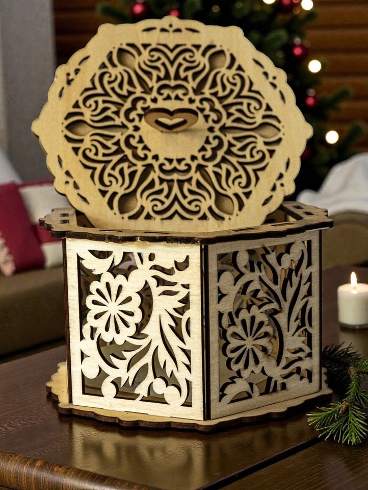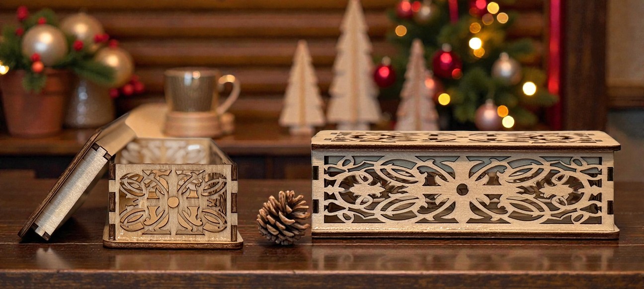 These handcrafted laser-cut boxes come in a variety of sizes and styles to suit your needs. Some designs feature open-top boxes with no lid, while others include fitted lids for secure storage. Several boxes showcase intricate laser-cut patterns or detailed engravings on the lid, adding a unique decorative touch to each piece.
