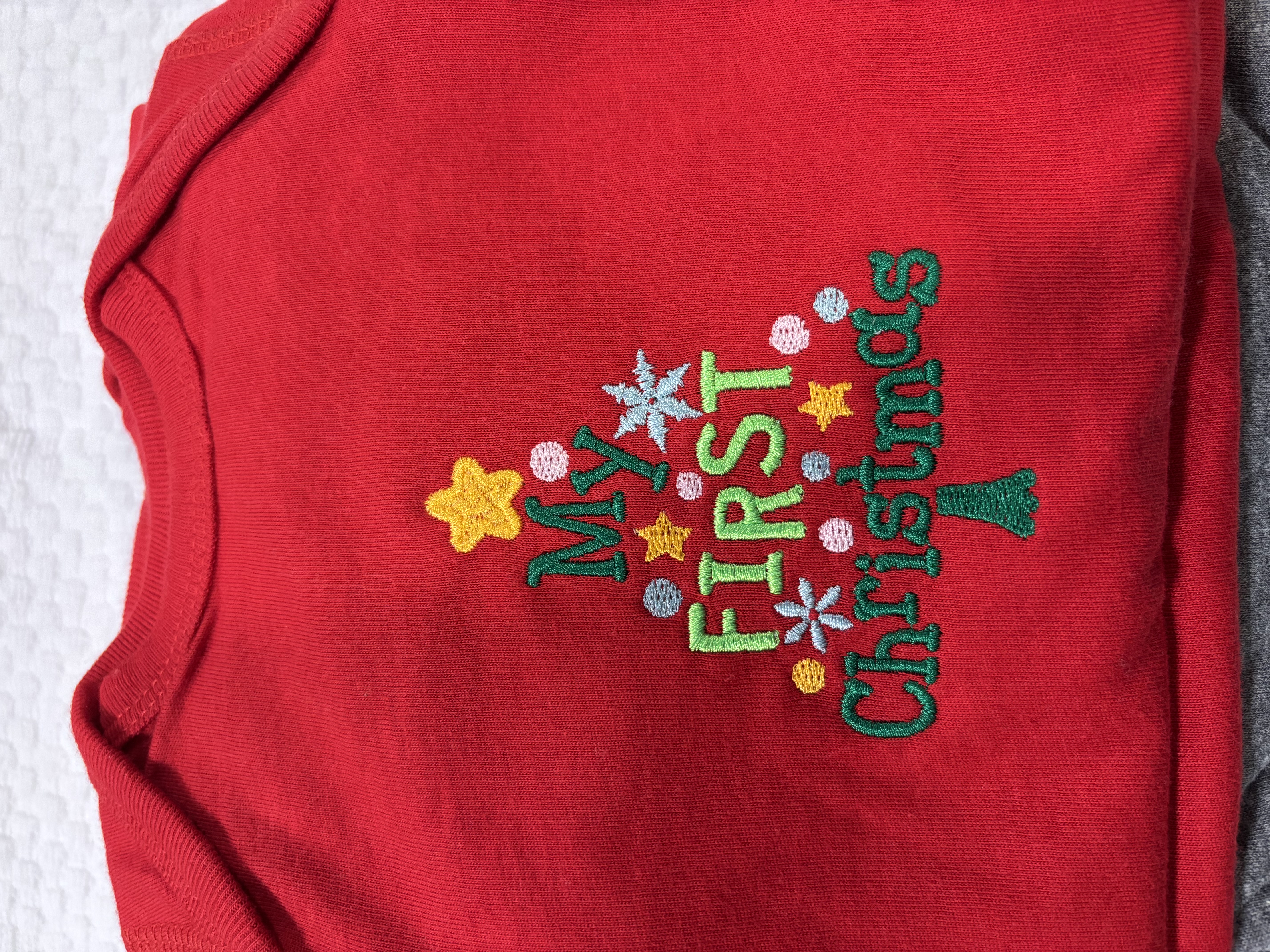 This is a long-sleeve onesie for baby’s first Christmas. Please specify in notes what color you’d like. We have red, grey, and pink in stock.