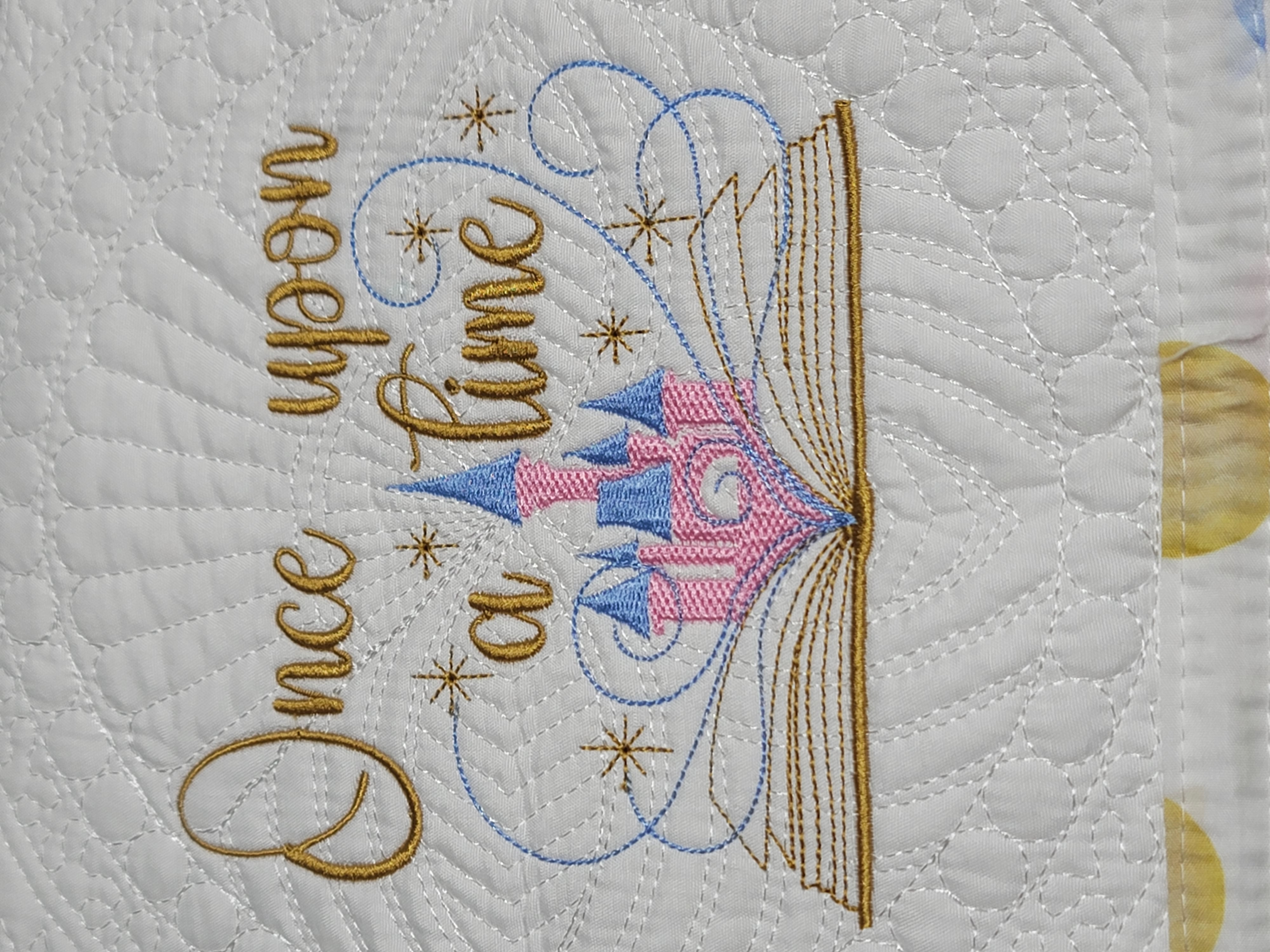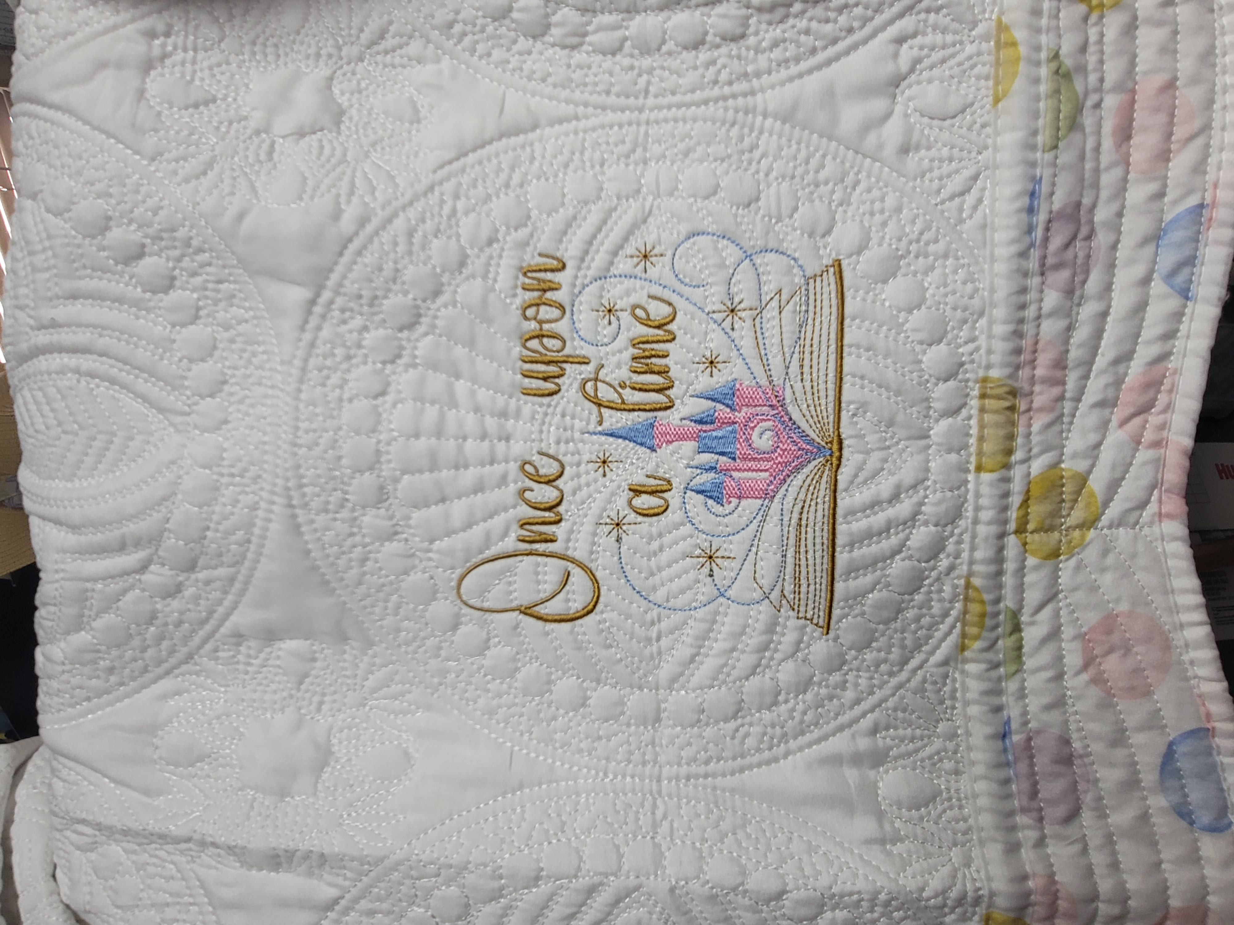 Bring fairytale dreams to life with this enchanting “Once Upon a Time” lap quilt. Featuring beautifully embroidered golden lettering, a magical open storybook, and a whimsical castle rising from its pages with sparkling accents, this quilt captures the wonder and imagination of childhood stories and bedtime magic. The crisp white quilted background highlights the intricate stitched texture, while the soft pastel polka-dot border adds a playful and dreamy finishing touch.