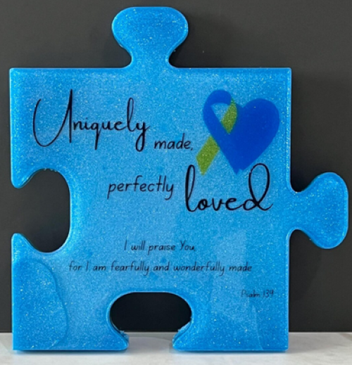 These handcrafted puzzle-piece plaques celebrate uniqueness, love, and purpose. Designed with inspiring messages and soft sparkles, each piece carries Scripture as a reminder of God’s love and intentional design.