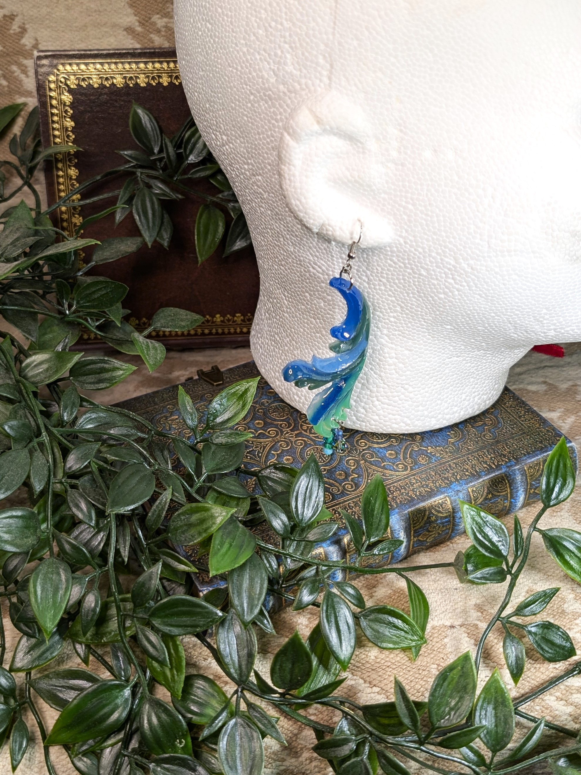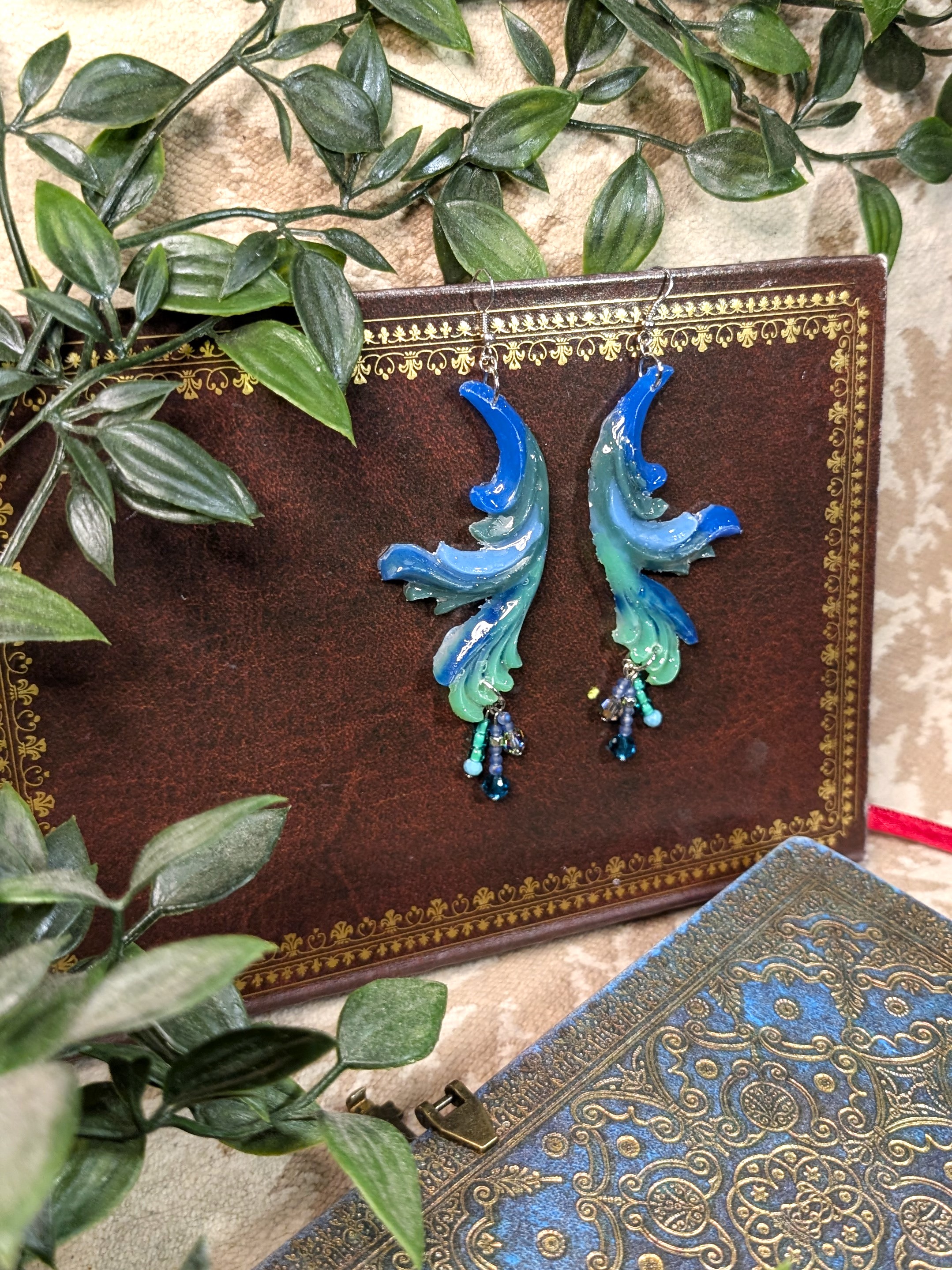 Original handmade earrings in semi-translucent blues and greens, with a cluster of dangling beads attached to each. Just when you thought my flourishes couldn’t get flourish-ier. You’d find similar designs on antique furniture or decorations with a rococo (or rococopunk, or baroque) flair. Showstopping, eye-catching size and shape, perfect for an event or for expressing yourself every day. These have a gloss finish.