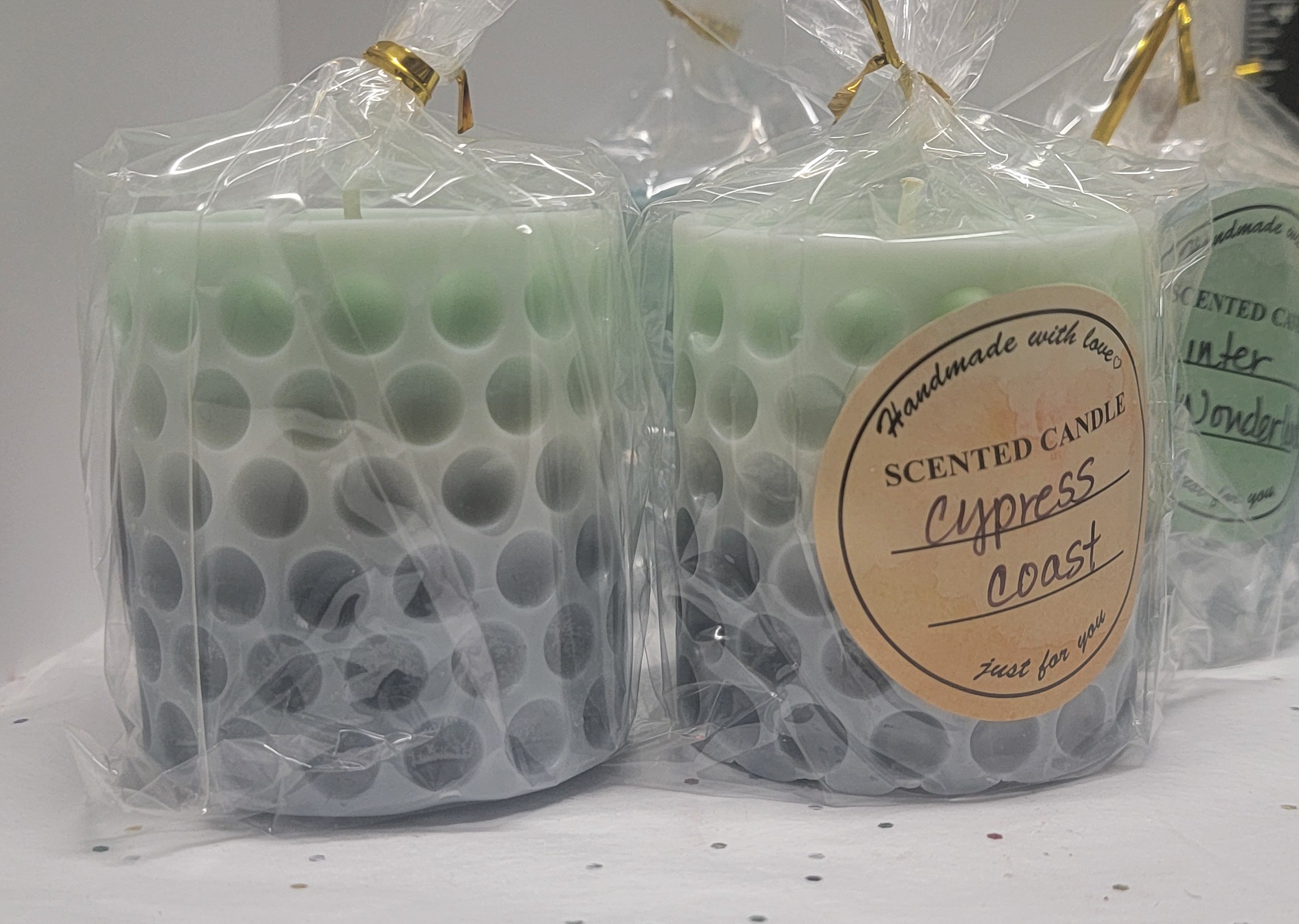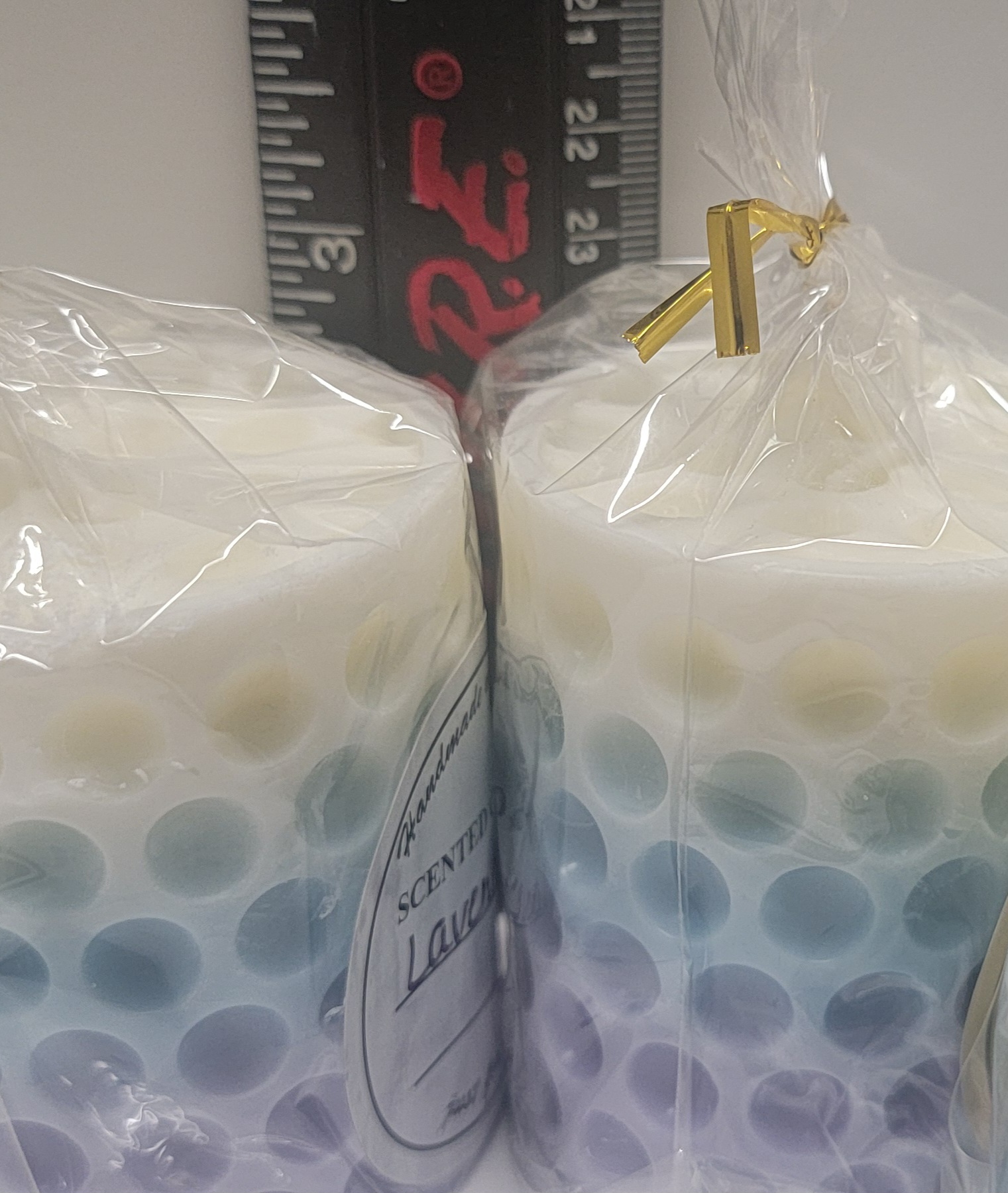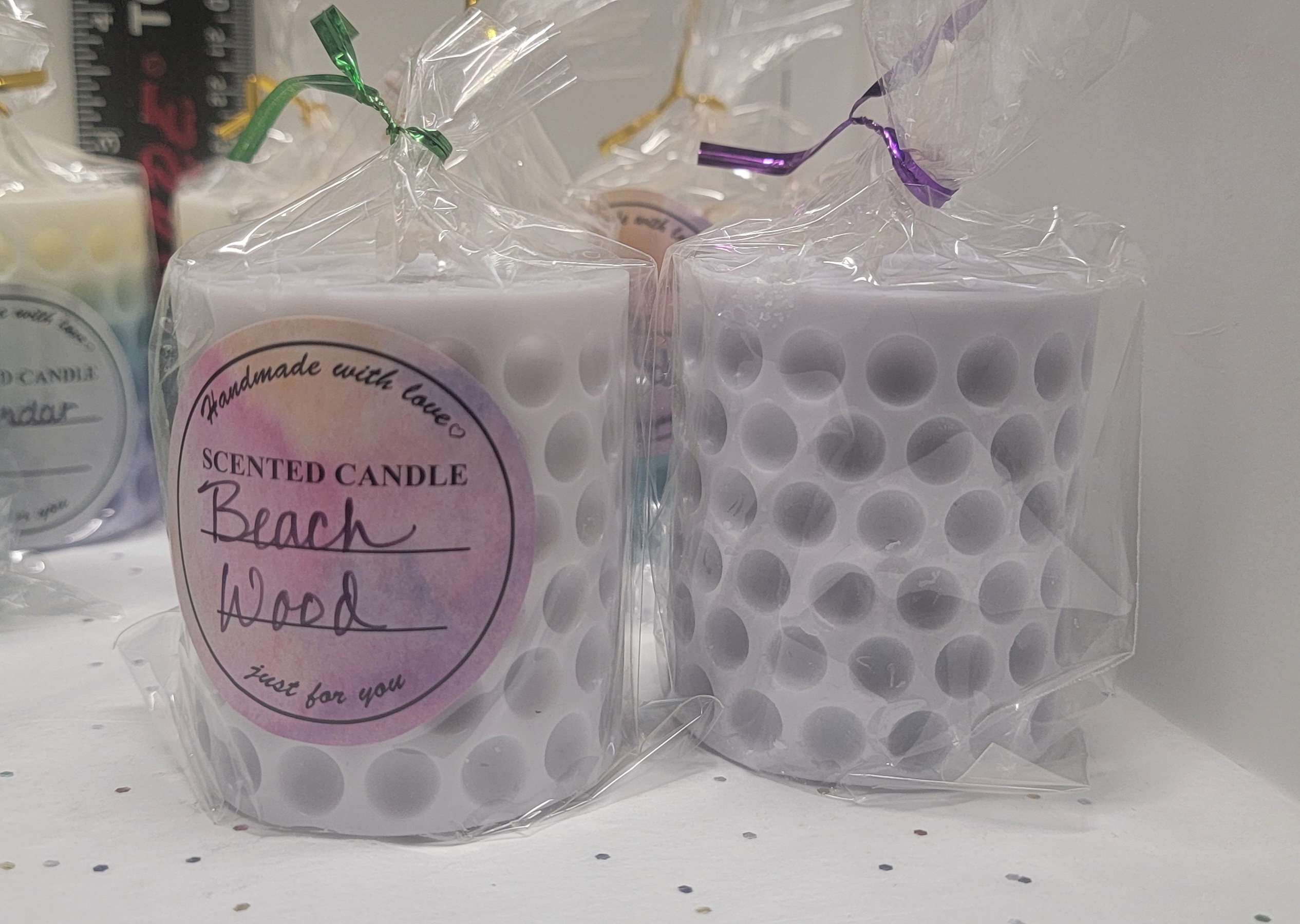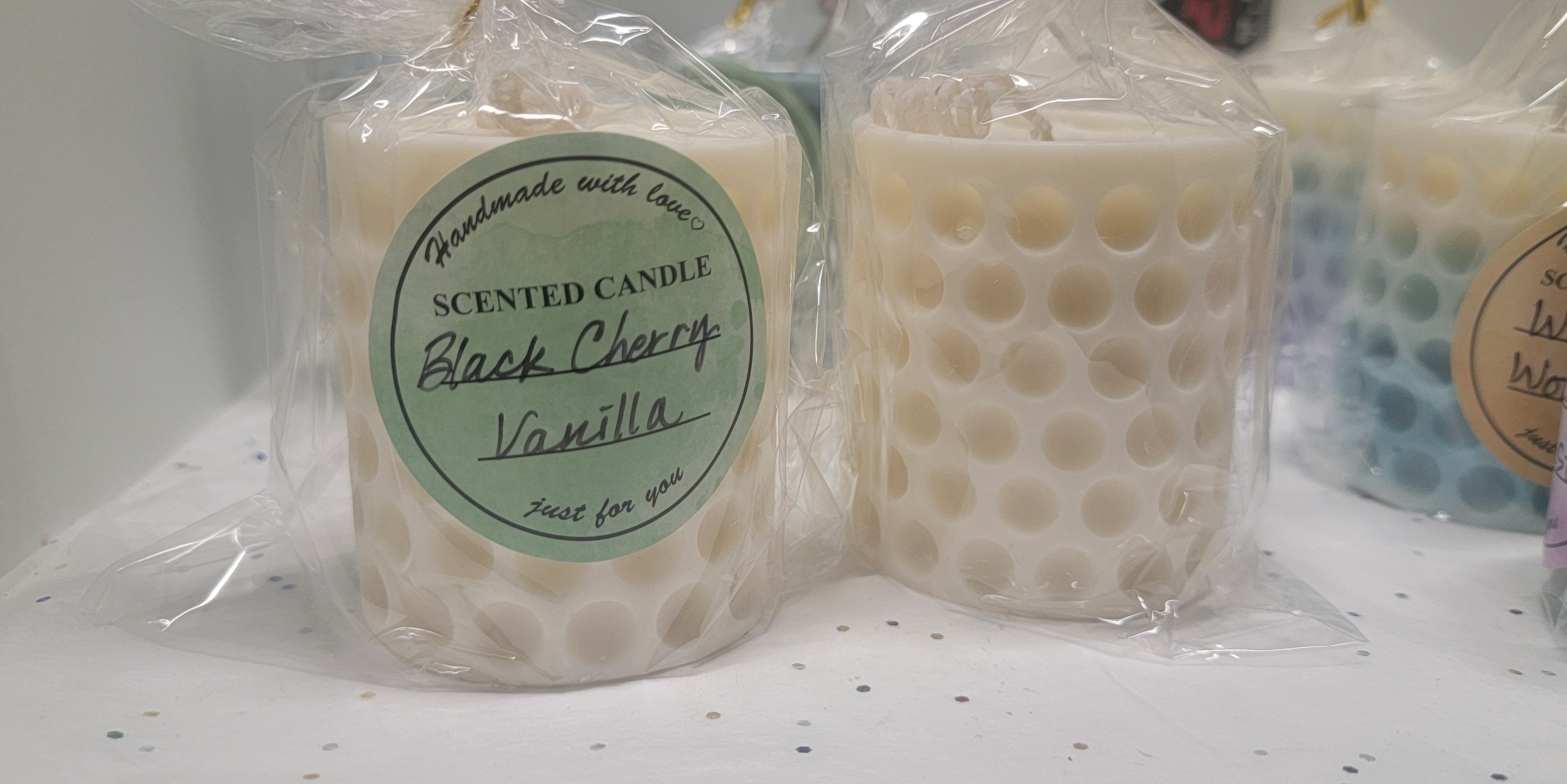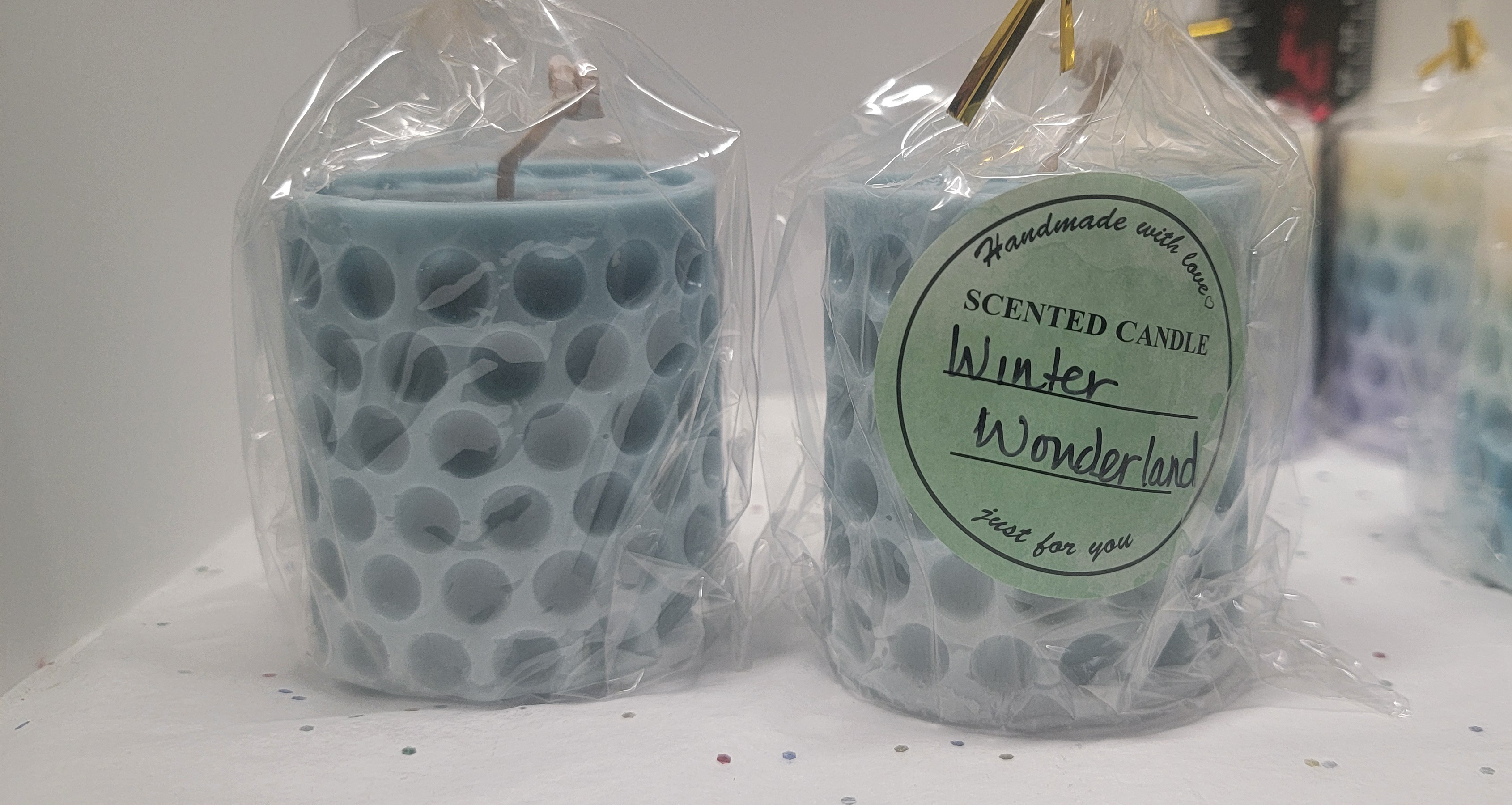 Two (2) hand-poured pillar candles. Scent soy candle with all-cotton wicks. This is a set of 2 candles. Fun design.