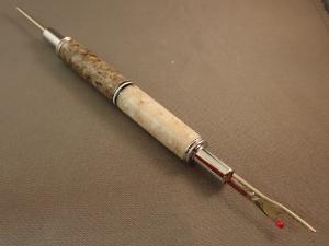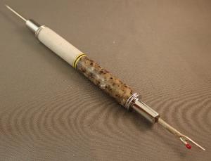 These Seamrippers are made from repurposed Solid Countertop material. A White Flecked piece and a Green and Brown Flecked piece joined by a Yellow Black Yellow piece of guitar pick guard. – Ergonomicaly designed for comfort over its lifetime – Each Seamripper holds 2 tools, a Seamripper Blade and a Sewing Stilleto – Ready To Ship – Processing Time 2 to 5 Days – Handmade in Washington – One Of A Kind Sewing Tool