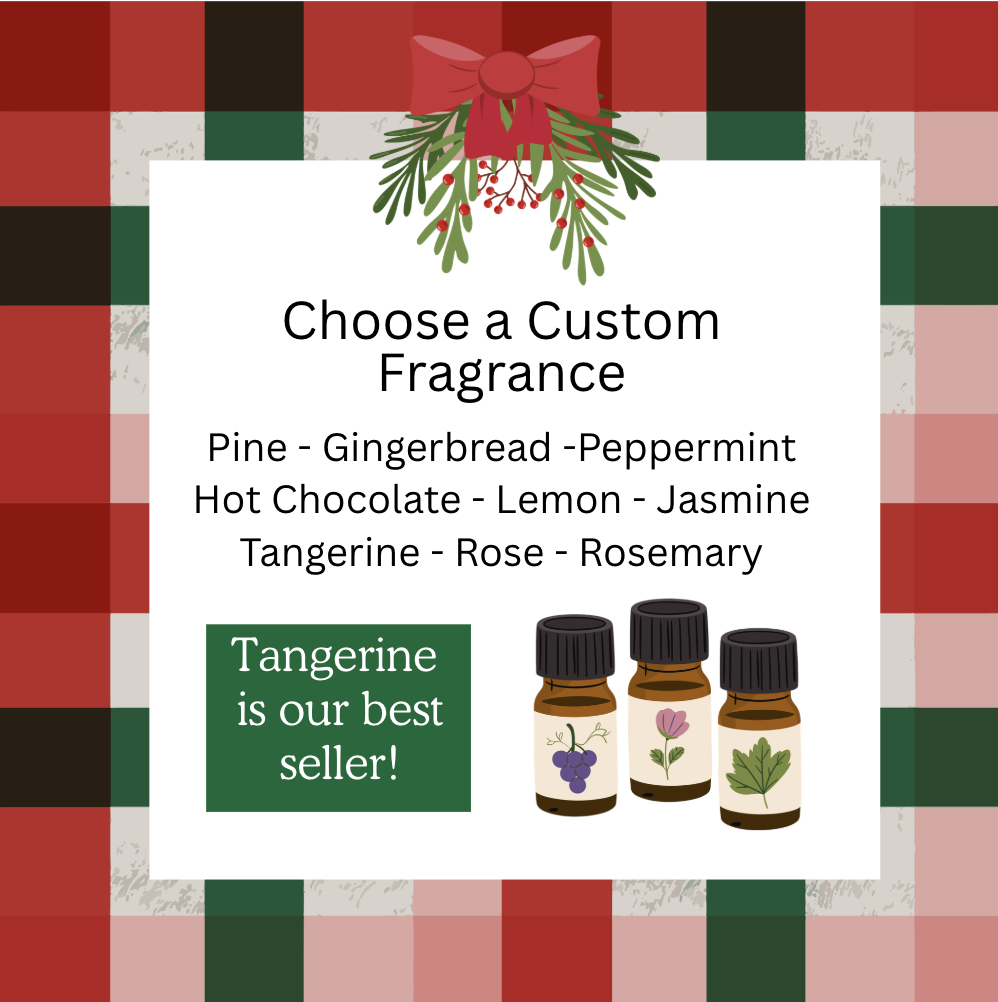 Tangerine, Lemon, Lavender, Jasmine, Pine, Hot Chocolate, Gingerbread, or Rosemary.