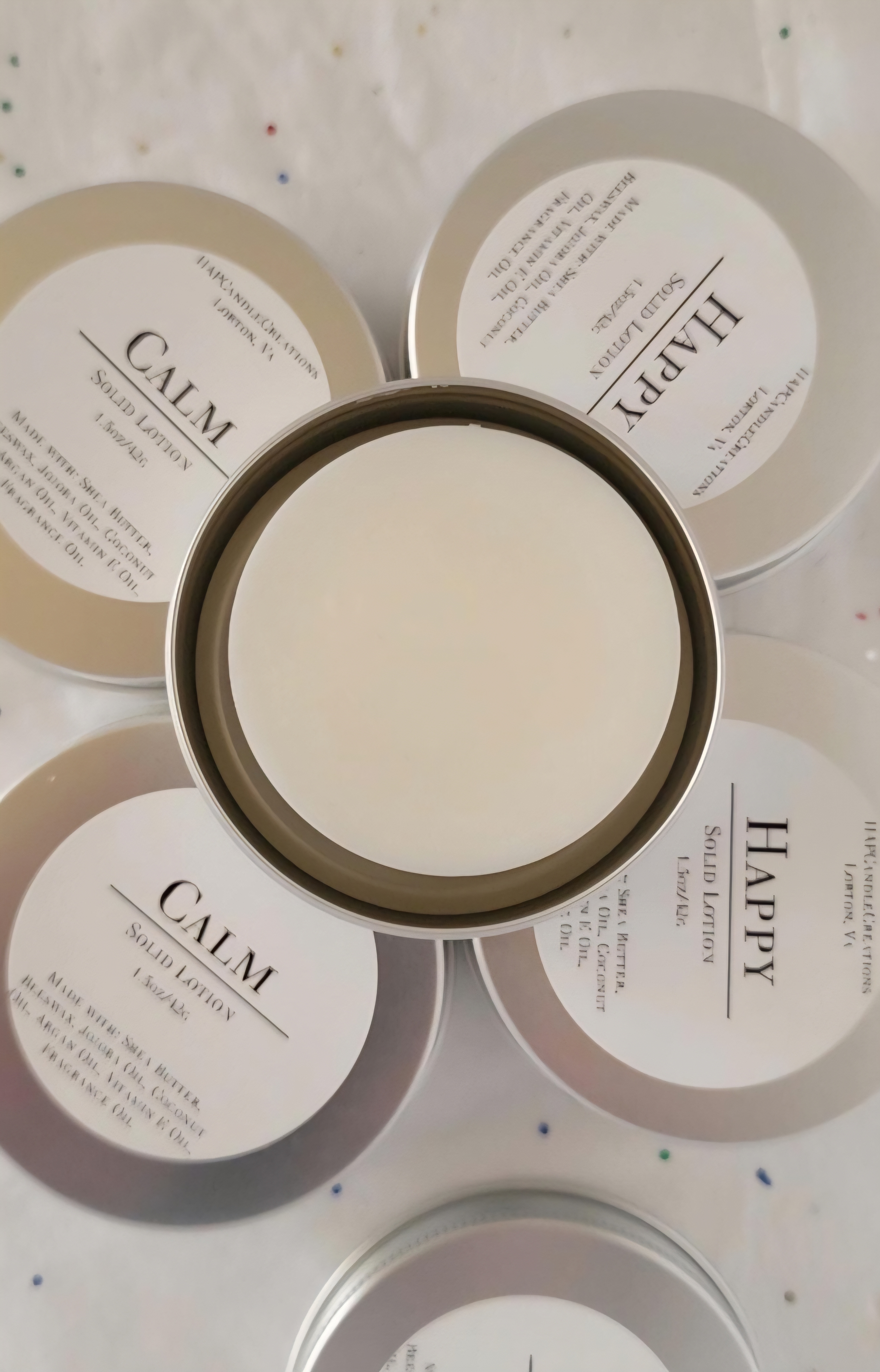 In January 2004, we began making our solid lotion with minimal ingredients that family, friends and coworkers love. We use all organic ingredients, quality oils and essential oils or skin safe fragrance oil.