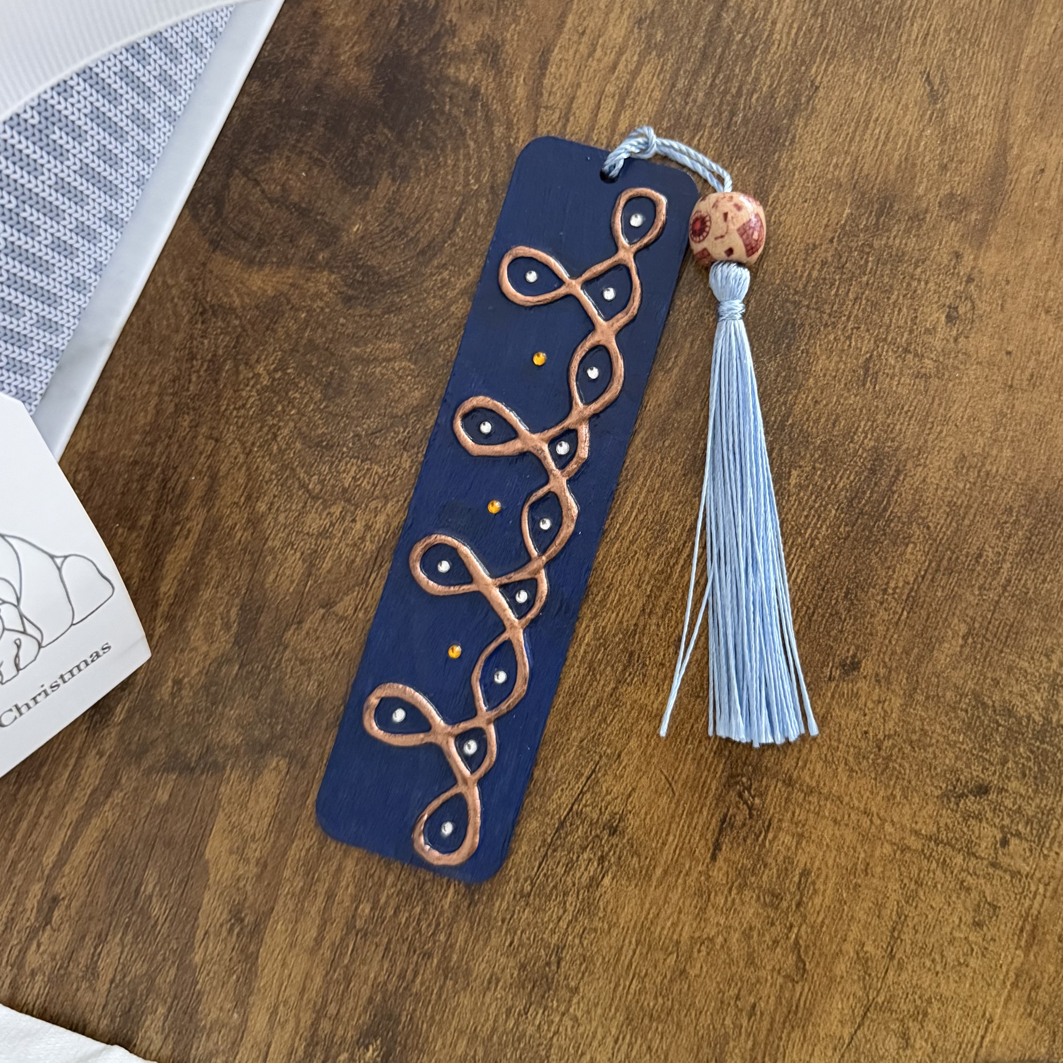 Embossed textured bookmark featuring layered heart motifs with 3D details. Comes in customizable colors with a tassel and bead accent. Inspired by traditional mehndi designs, this embossed bookmark has intricate, touchable details. Textured bookmark blending the cozy vibes of books and coffee visuals. Ideal for book lovers and coffee enthusiasts alike. Miniature textured artwork showcasing a stacked bookshelf design. Perfect for readers, decor lovers, and display-worthy reads.