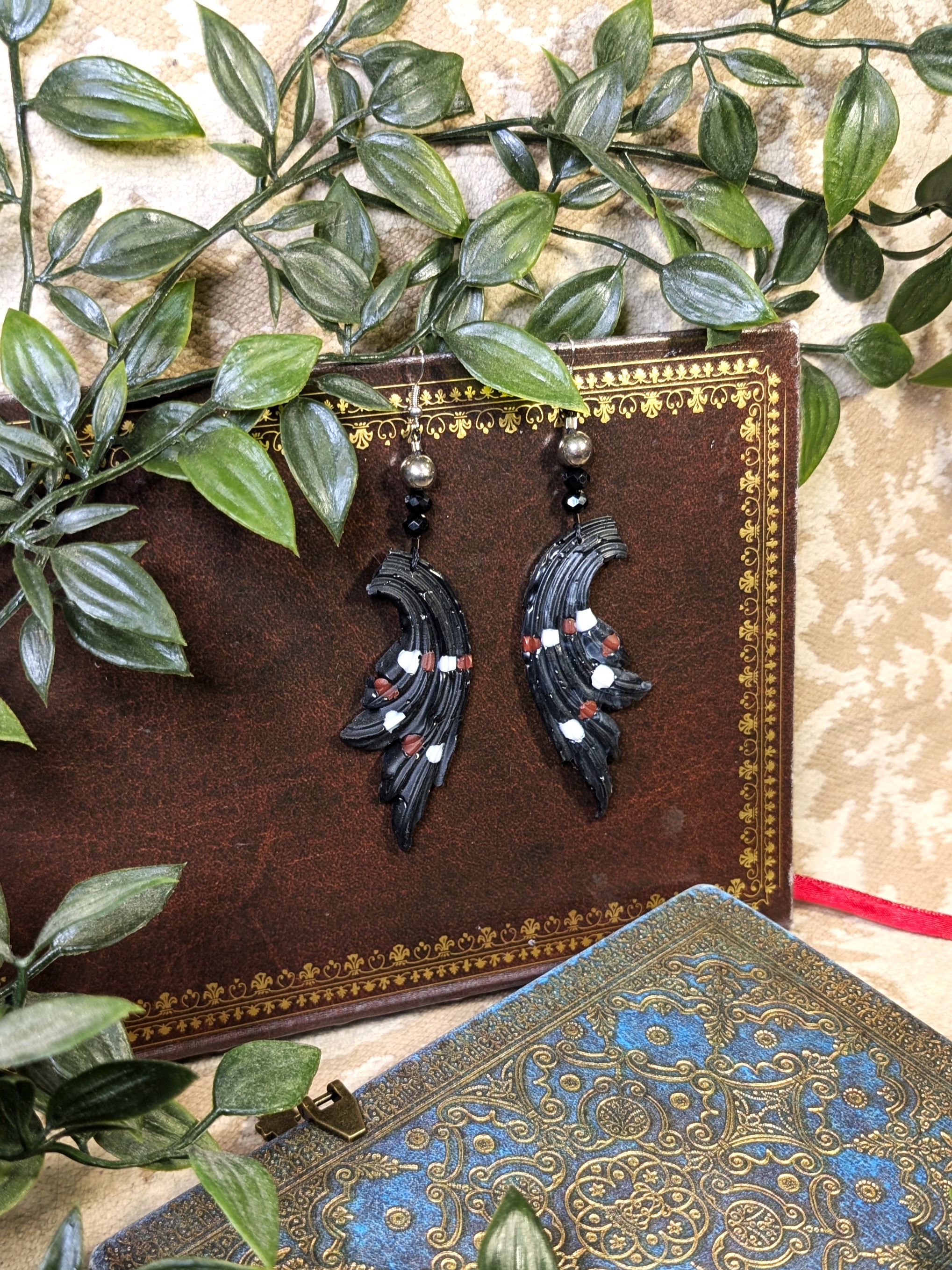 Original handmade earrings in semi-translucent red with white accents and gold and black beads, a colorway named “ringmaster.”