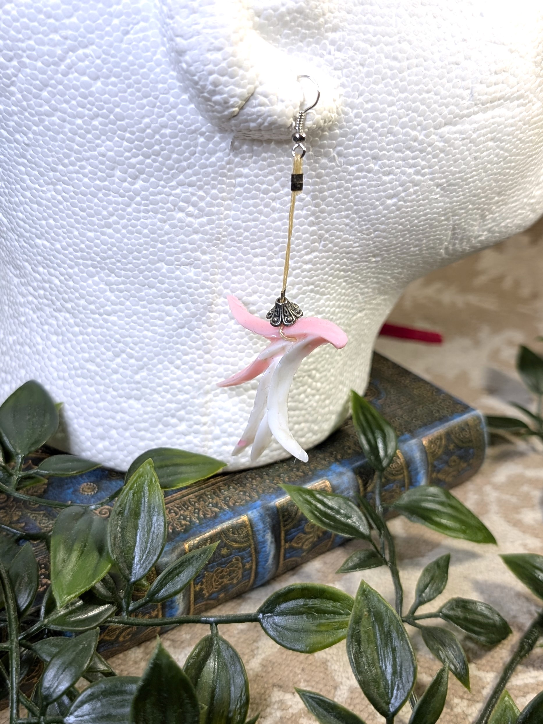 Original handmade earrings in semi-translucent white with pink spots and a darling little heart dangling from one of the earrings, a colorway named “perfect angel.”