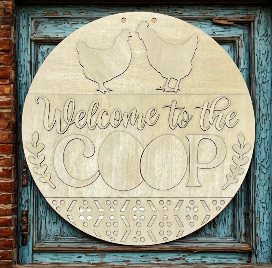 – Design includes two chickens at the top, “Welcome to the COOP” text with decorative elements, and a pattern of shapes at the bottom Perfect for DIY enthusiasts, farmhouse decor lovers, or anyone who adores chickens!
