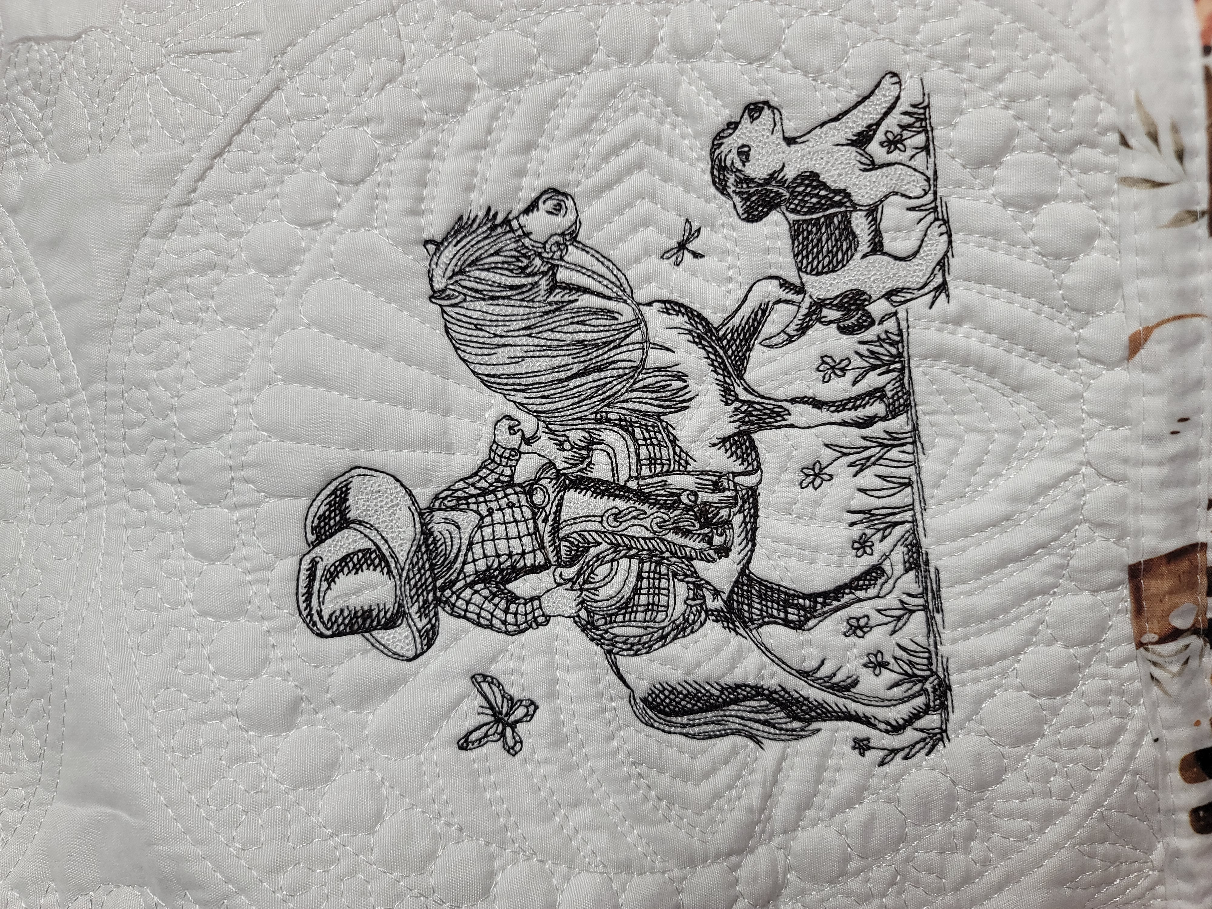 Capture the spirit of the open range with this charming Western Cowboy lap quilt. Featuring a beautifully detailed embroidered scene of a young cowboy riding his horse alongside a loyal pup, surrounded by butterflies and wildflowers, this quilt tells a sweet story of adventure, friendship, and country life. The crisp white quilted background highlights the intricate stitching, while the western-themed fabric border adds the perfect rustic finishing touch.