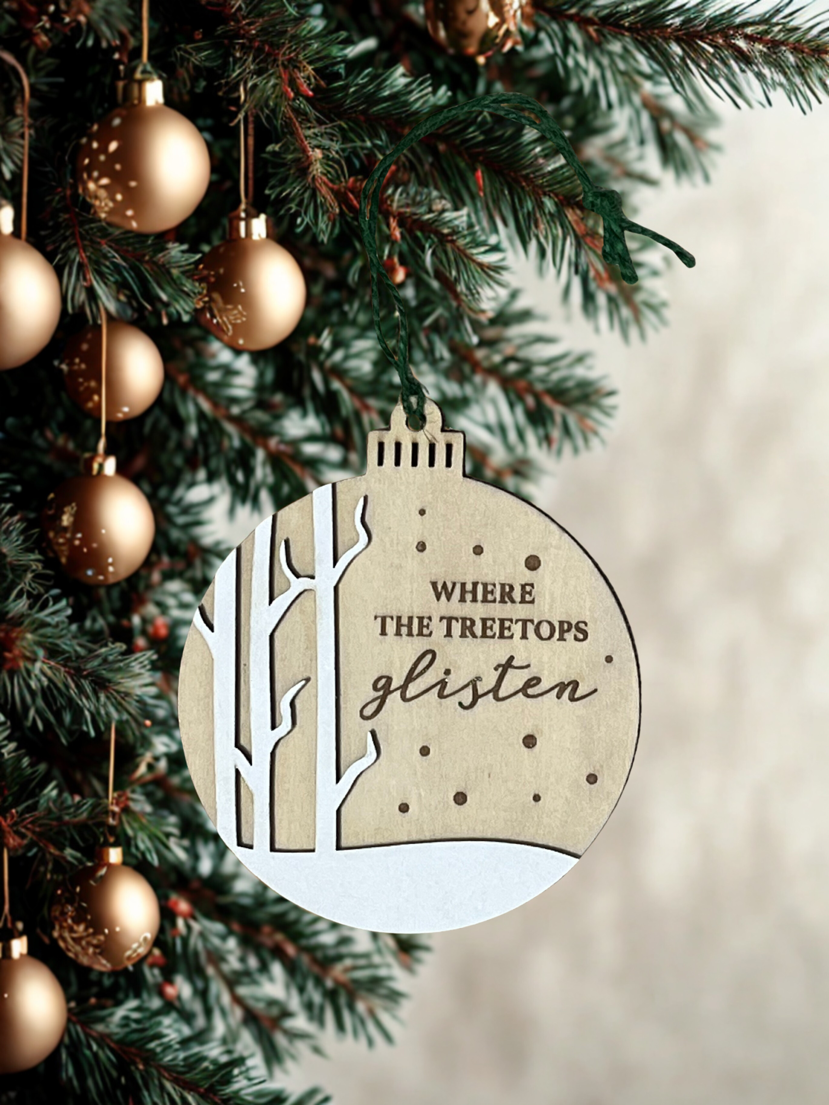 Add a touch of rustic ch’arm to your holiday decor with our handcrafted Where the Treetops Glisten Wooden Ornament.