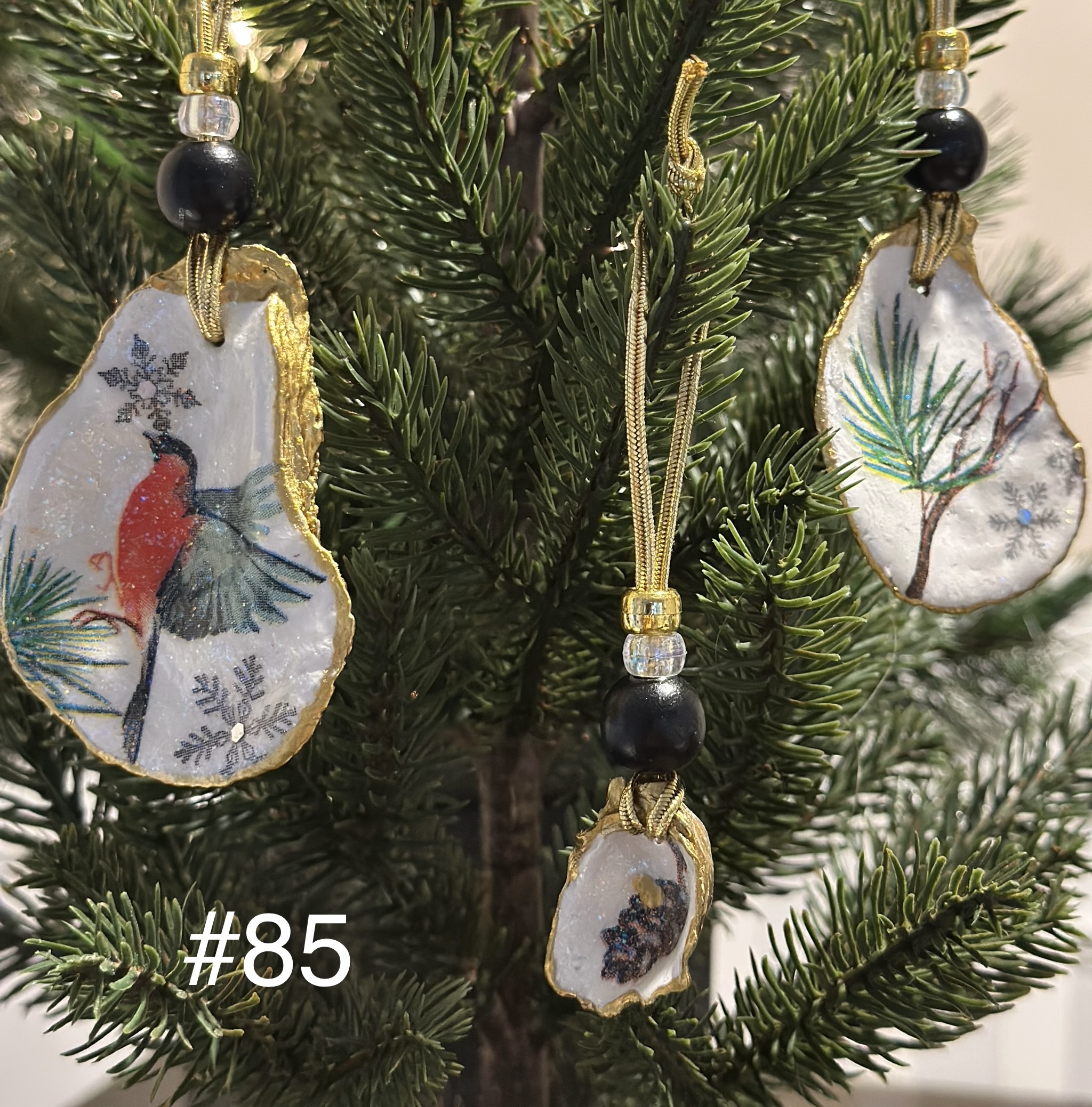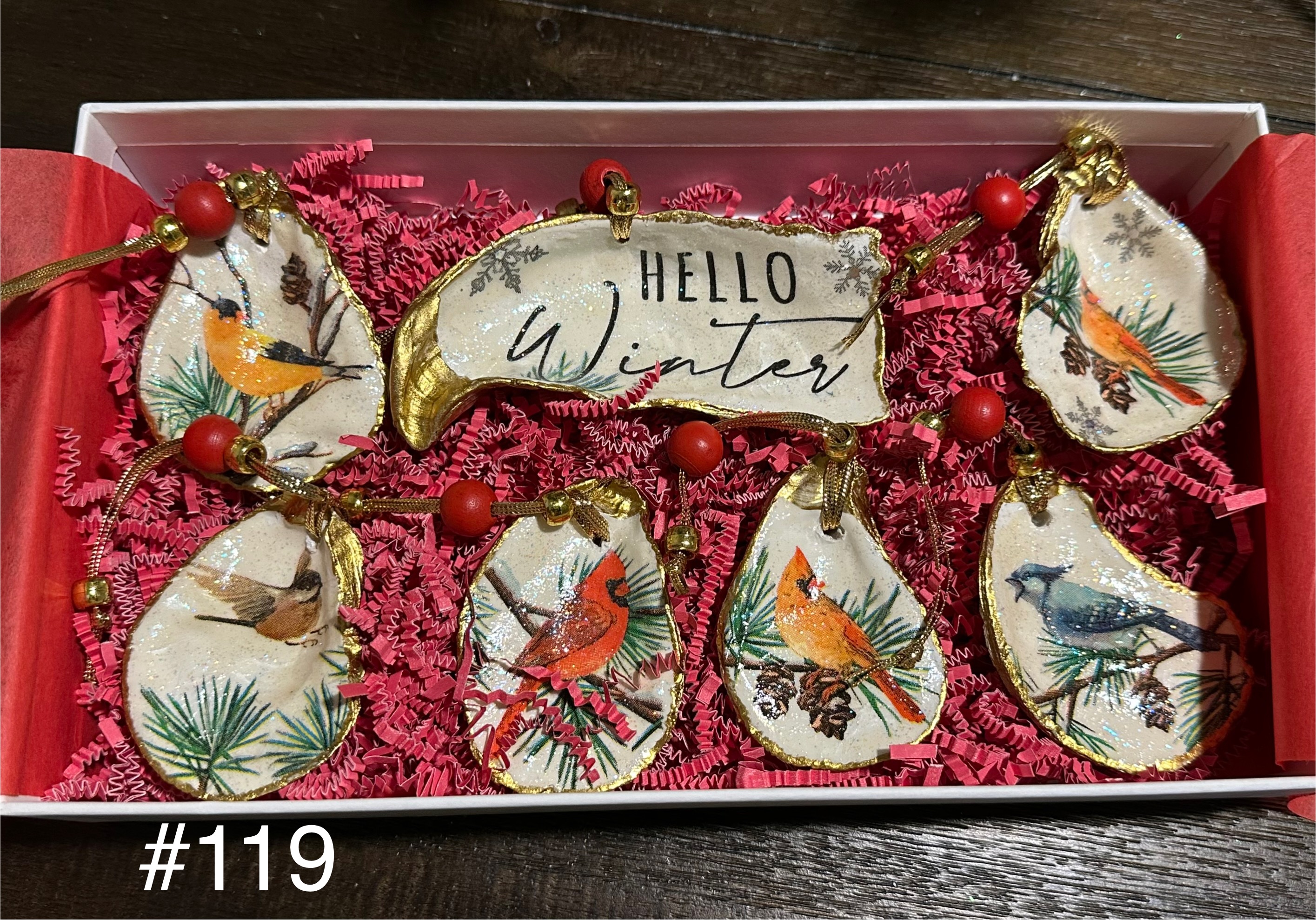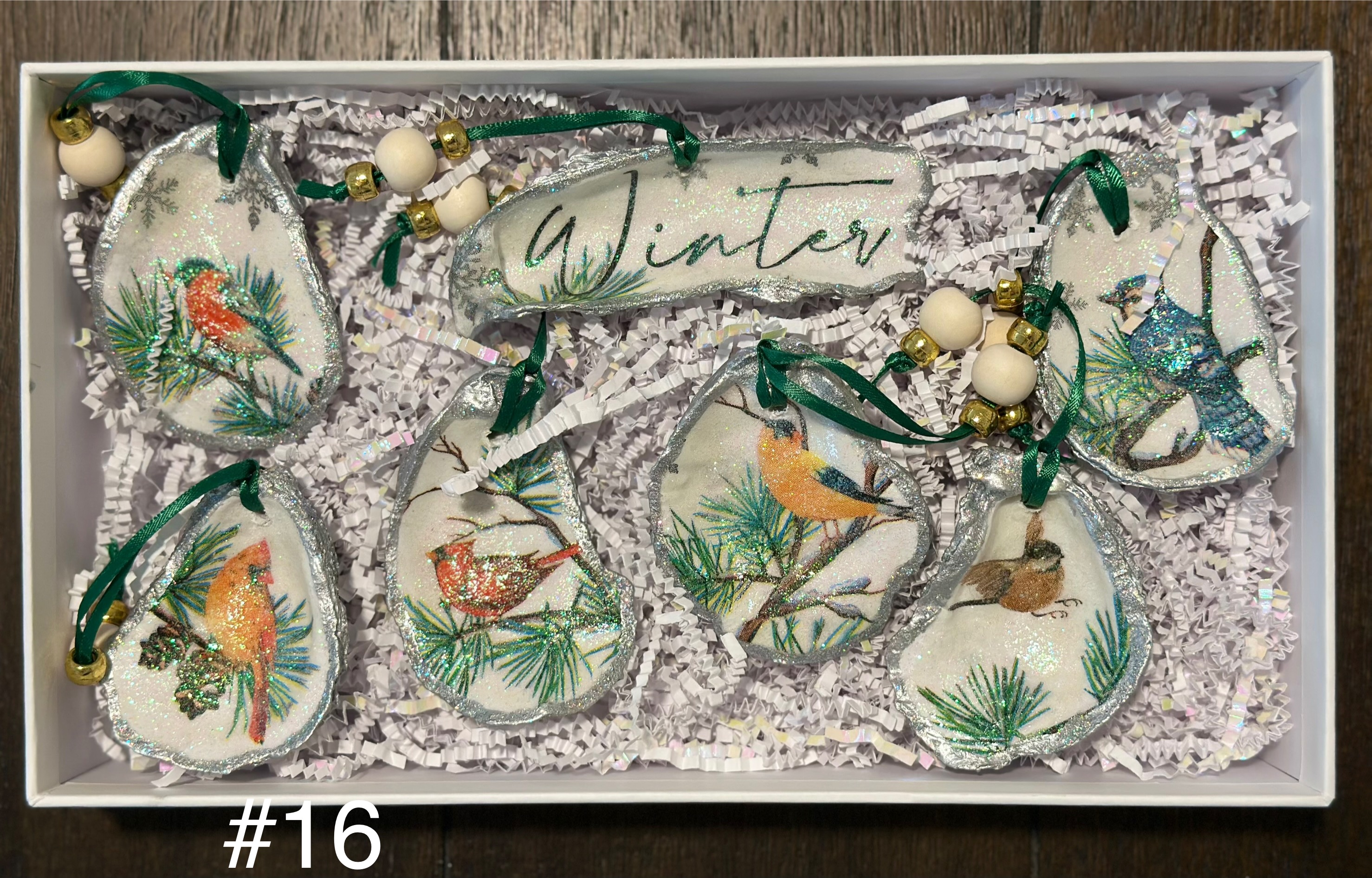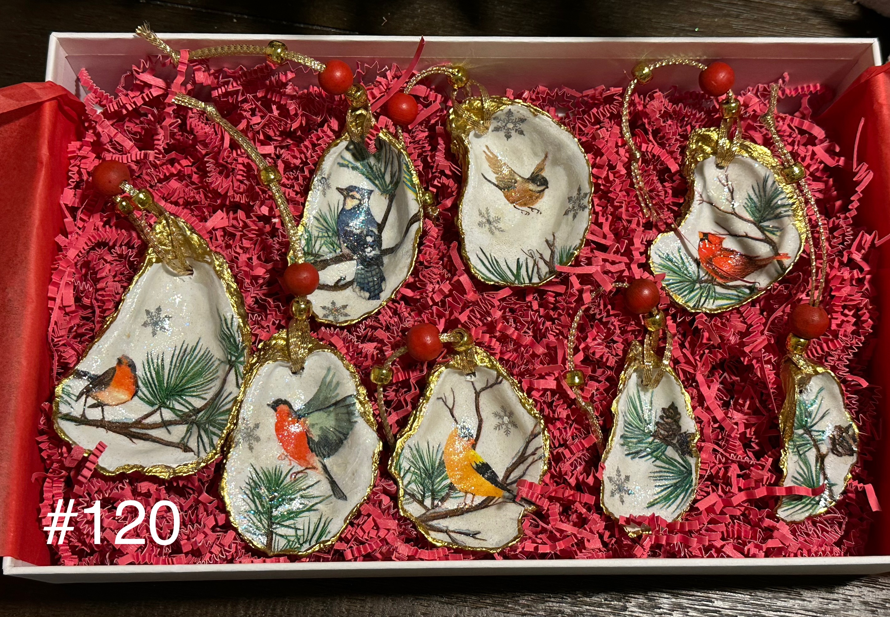 • Winter bird oyster ornament sets which could include cardinals, blue jay, chickadee, scarlet tanager, and grosbeak.
