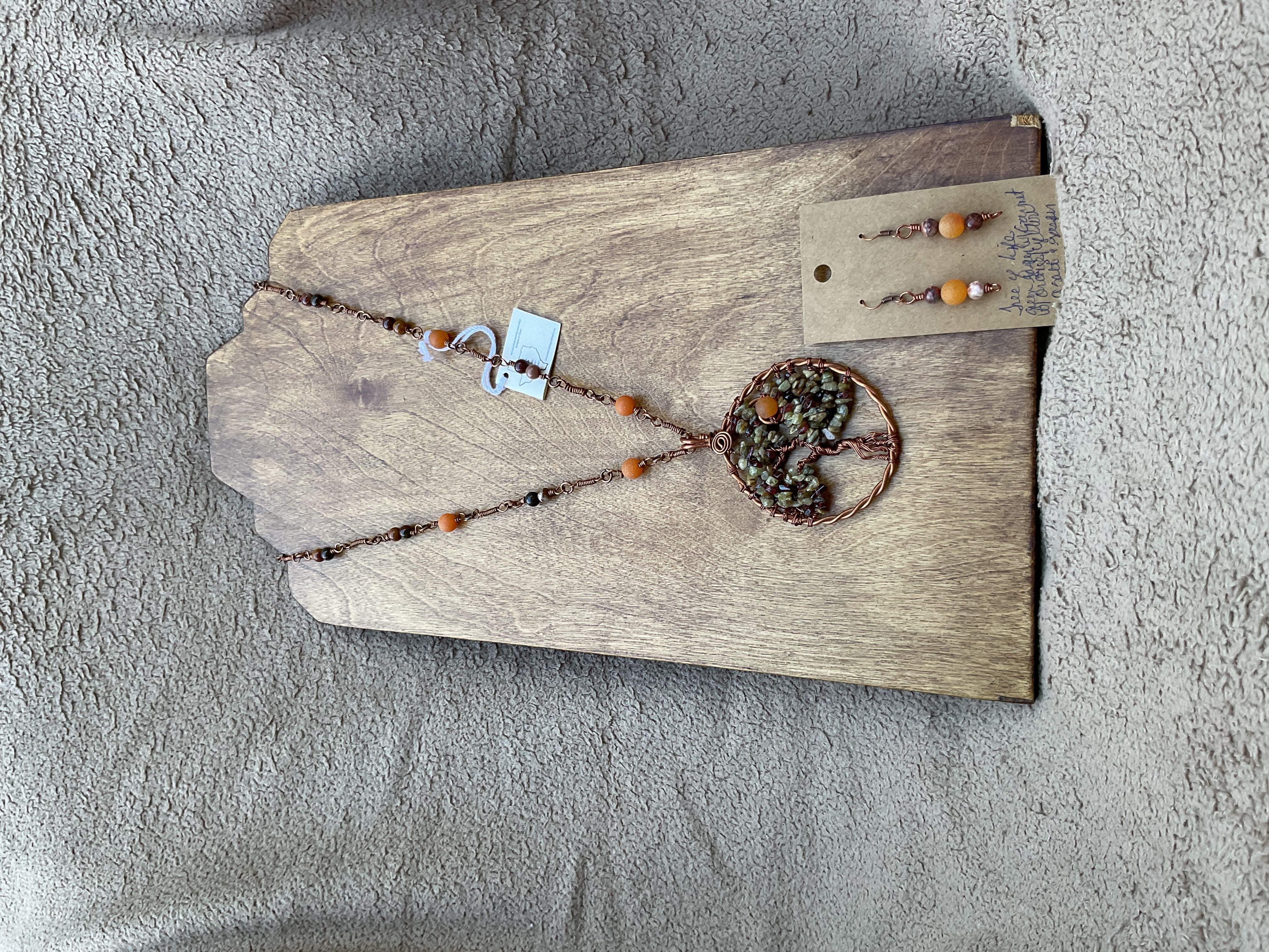 Made with Green Agate Chips and Garnet Chips with an Orange/Yellow Agate Moon – wire wrapped to a Twisted Copper Wire. Chain is a Handmade Chain with Orange/Yellow Agate and Jasper Beads. Earrings are made with Jasper Beads and Orange/ Yellow Agate Beads.
