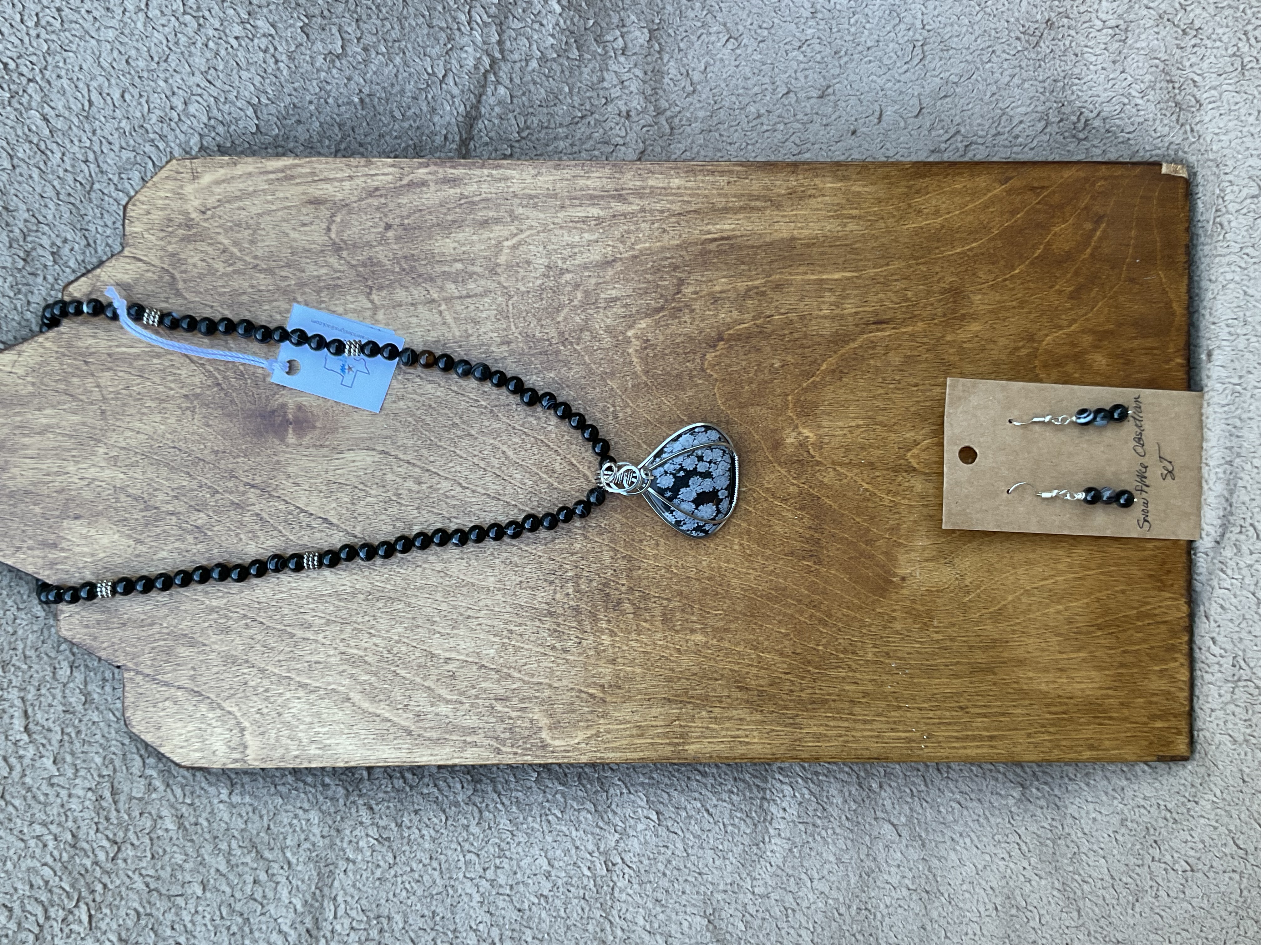Wire Wrapped Snowflake Obsidian wire wrapped with Titanium non tarnish wire on a Black Onyx beaded necklace with silver accents