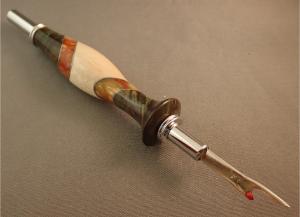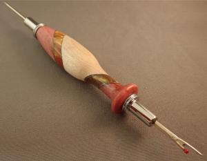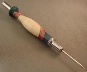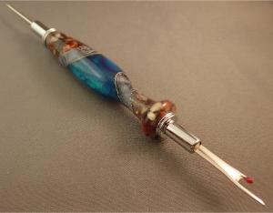 These Seam rippers are made from combination of Clear Wood, Dyed Wood, Acrylic, and Aluminum Cans. This one is made from Blue and Red Acrylic pieces, Green Dyed Maple stripes, and Aluminum bands from Aluminum cans. – Ergonomically designed for comfort over its lifetime – Each Seam ripper holds 2 tools, you choose from 3 options. 1) Seam ripper Blade; 2) Sewing Stiletto; 3) Needle Threader – Ready To Ship – Processing Time 2 to 5 Days – Handmade in Washington – One Of A Kind Sewing Tool